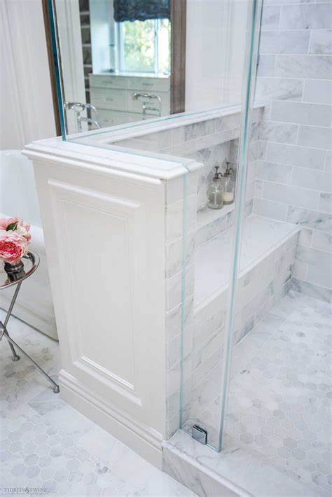 Create hidden storage in the shower using a pony wall. I got this tip from an Interior Design Facebook group and love the idea of keeping all the shampoo and other bottles hidden. We are going to incorporate this into our new home build.