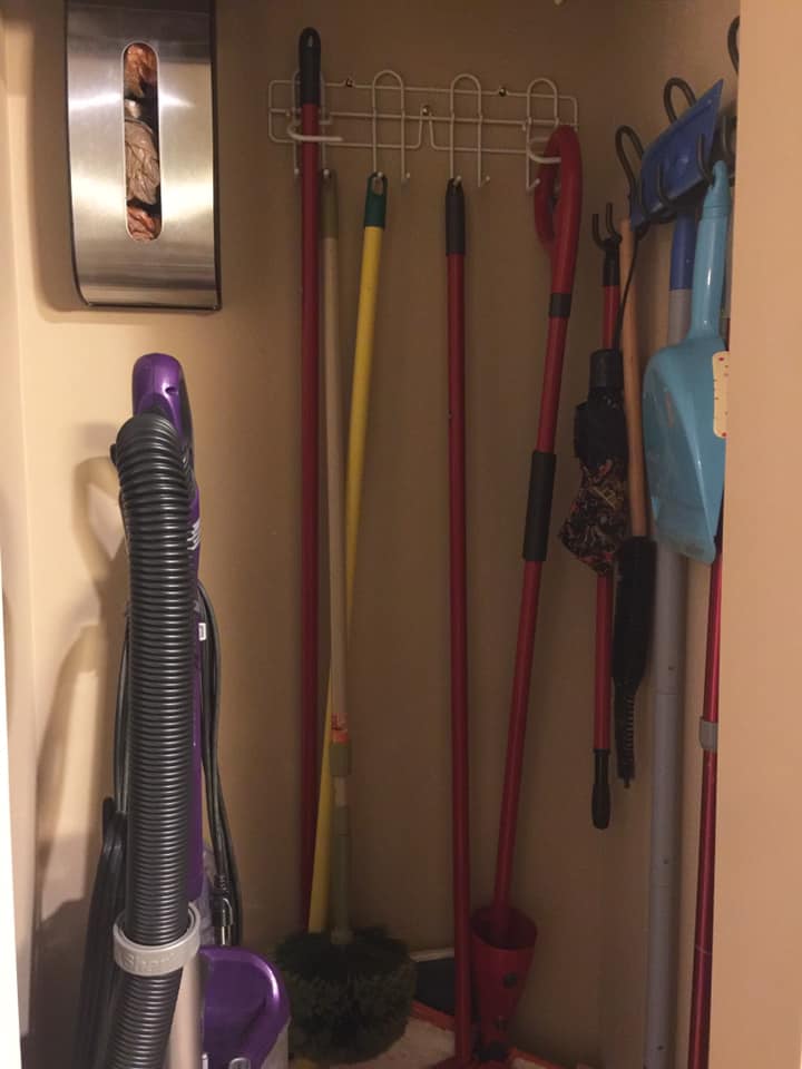 We like to celebrate wins, even if it is a organized broom closet. Jim installed a second rack for brooms, mops, dusters, etc. leaving room for a leash, doggie bag holder, vacuum and shark tile/carpet cleaner. We have dog towels and a large wicker bin for toys and supplies on a shelf above the racks.