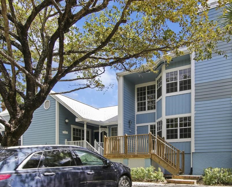 Our Ocean Dunes Fixer is perched up on a rise giving it a treehouse feeling when you enter. The back screened patio is raised a bit with steps down to a small garden. It has a lot of cool features that make the place special. For example, the location close to the beach, a lofted entrance with a floating staircase, and lots of light from the many windows. The original inspiration, Nantucket is still honored with varied and distinctive facades, moulin windows, as well as a blue and white color scheme. I am happy to say that we met a few of the neighbors already.