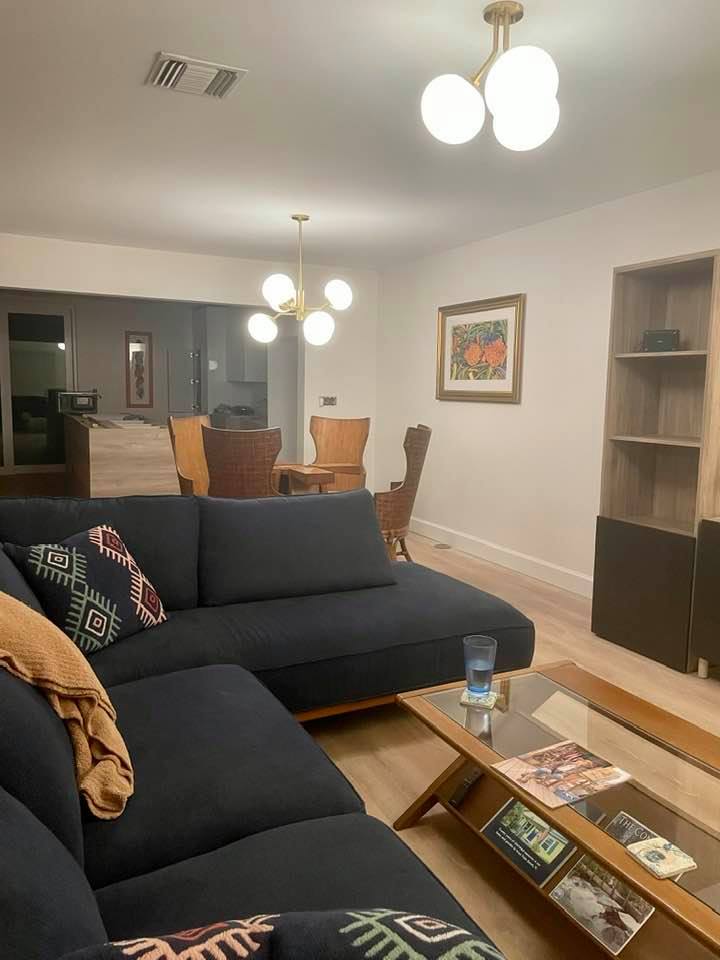 A final note about today’s open floorplans-acoustics can be challenging in an open space. Add plenty of textiles-upholstered furniture, rugs, throws, and pillows to help absorb sounds. You can also use shelves filled with books and plants to improve your room’s acoustics. As you can see from the picture below, opening the wall between the kitchen, dining and living rooms brought lots of natural light. The lighting from AllModern looks stunning in the living and dining rooms, plus they are both on dimmers.