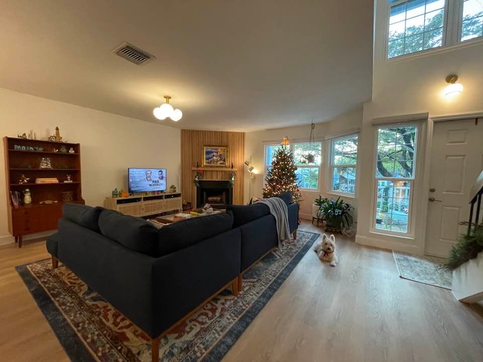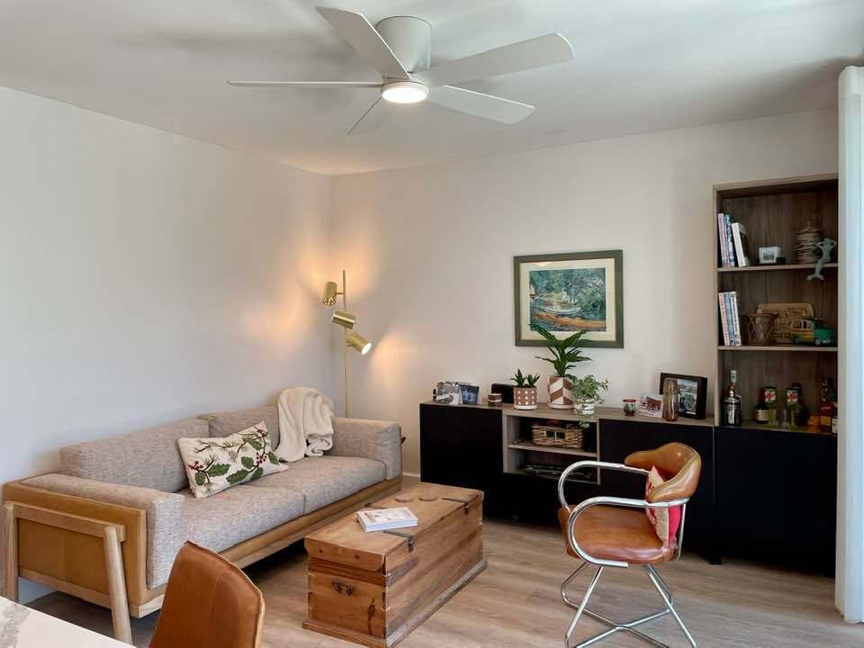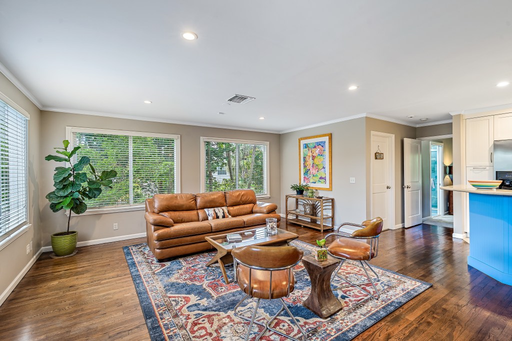 The Kardiel sofa, Atomic Age MCM chair, as well as the other pieces in the space below work well for relaxing, reading and provide extra storage of the kitchen.