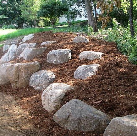 To create a natural boulder setting we will hand pick our boulders, then bury the widest part of each rock, as the picture below illustrates. Be sure to vary your size and choose a few flat angled rocks to point towards the view or special plant. If you’re not sure how to create safe slopes, you’ll want to hire a landscape professional. We will rent equipment to help us contour our land, move dirt, plants and heavy boulders.