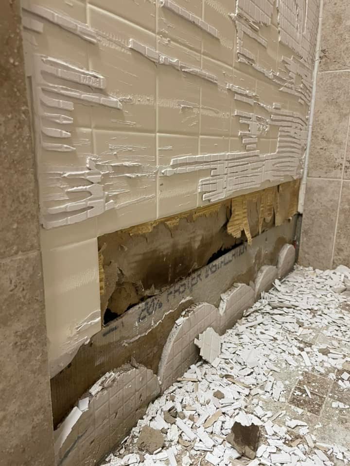 As you can see from the above photo, they cut away the bottom layers of original shower tiles and just used mortar to install the new tiles on top. We suspect the bottom tiles were compromised and instead of adding concrete board or taking out all the tile, they just filled in the gap with extra mortar. No water proofing was done on the shower walls.