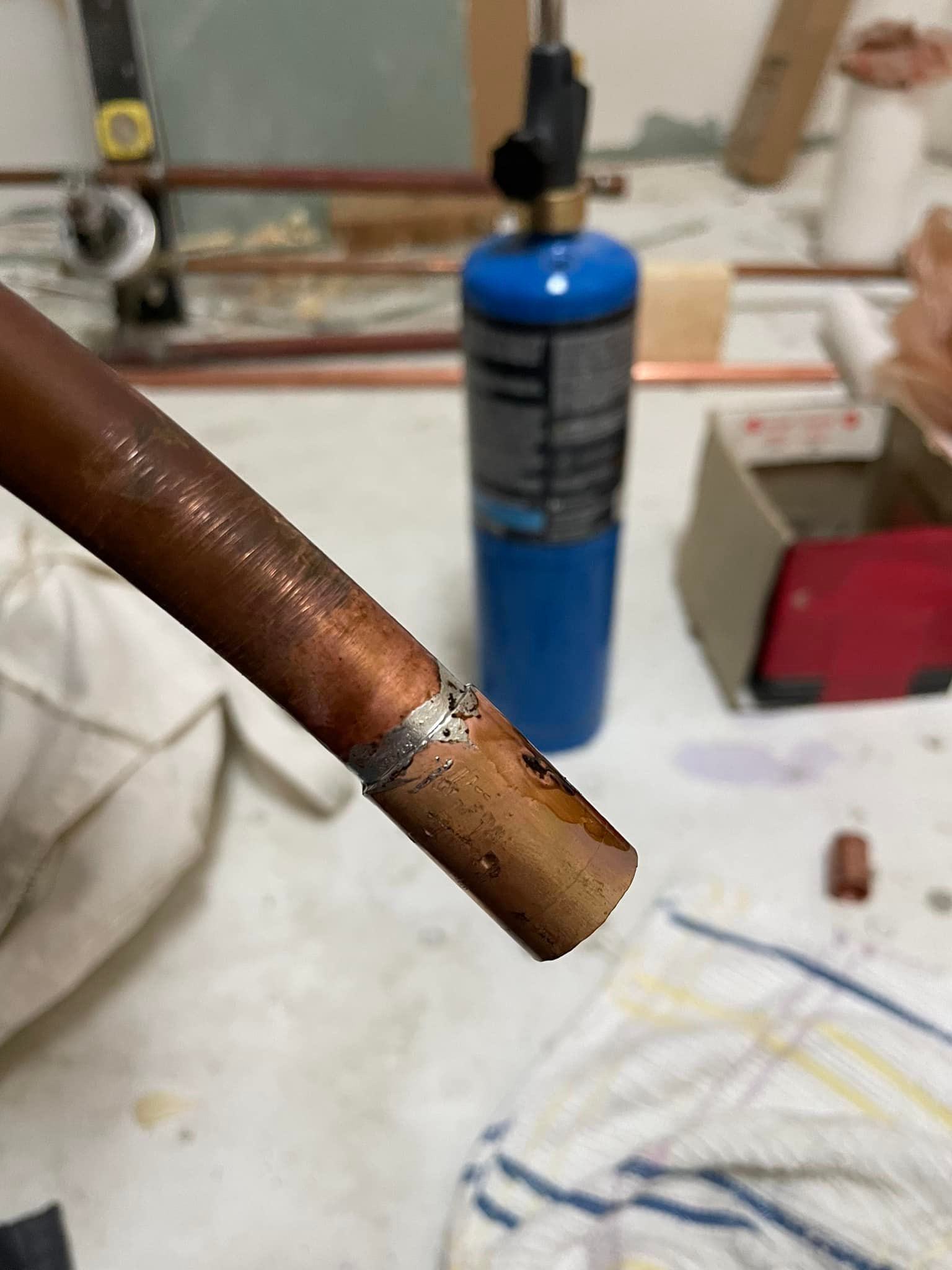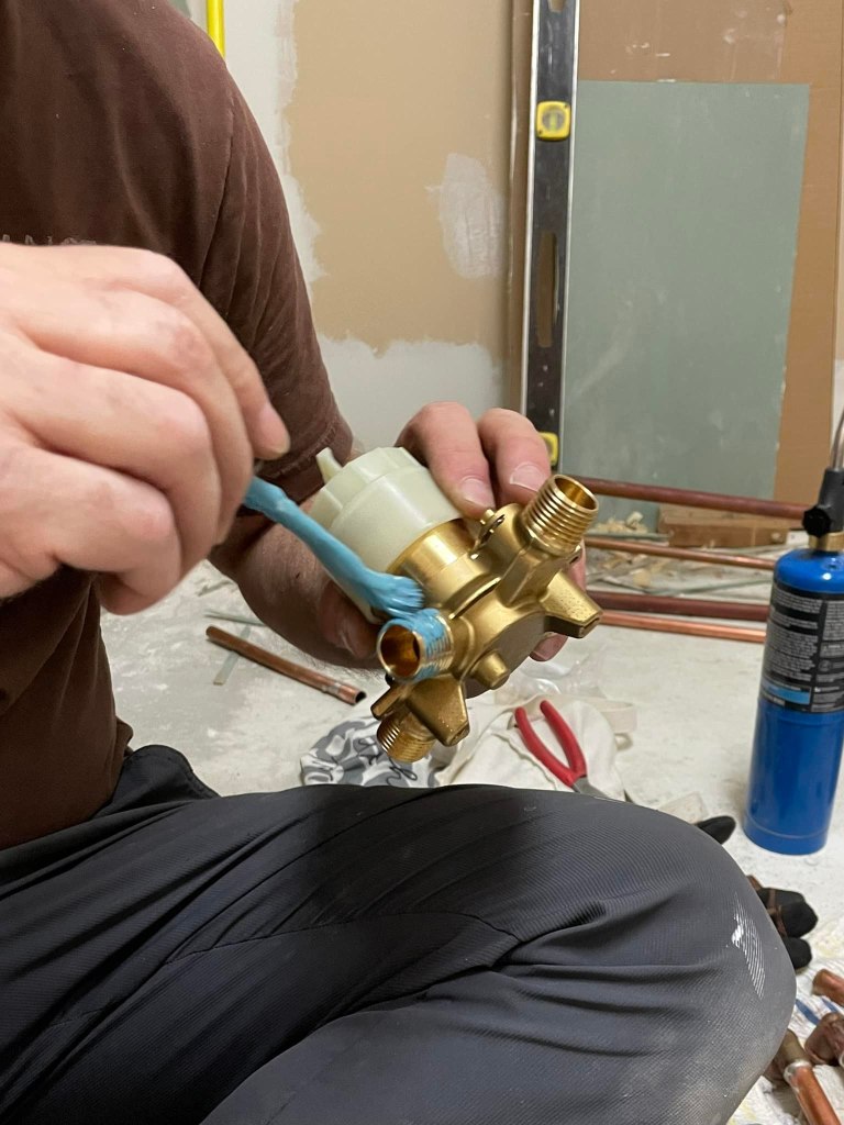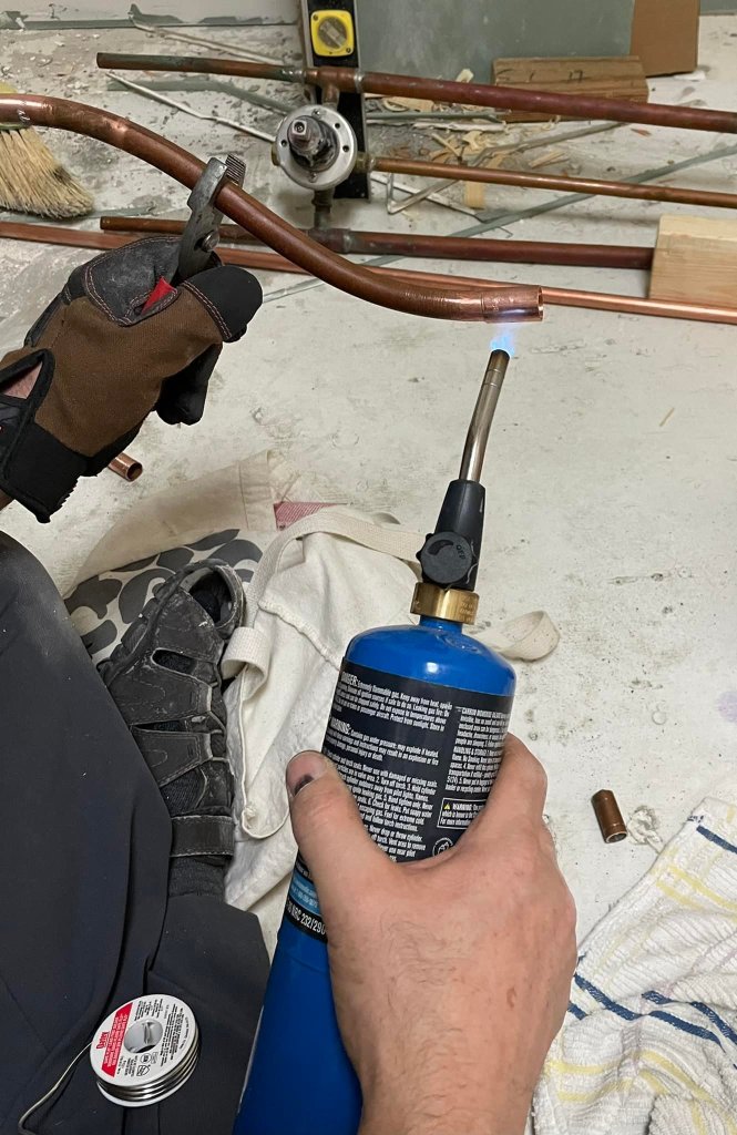 My husband, Jim is handy, smart, and is willing to learn new skills, which meant tackling the plumbing for this bathroom remodel would be possible. In the picture below, you see him heating the copper pipe and a fitting, which requires soldering to ensure it is leakproof.