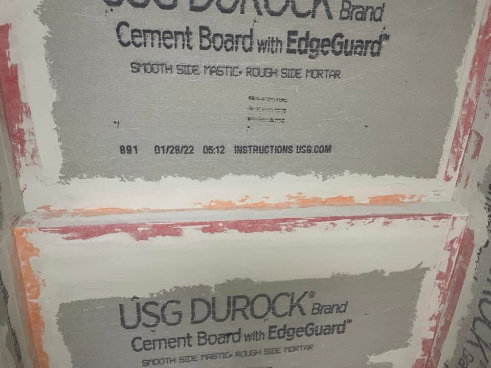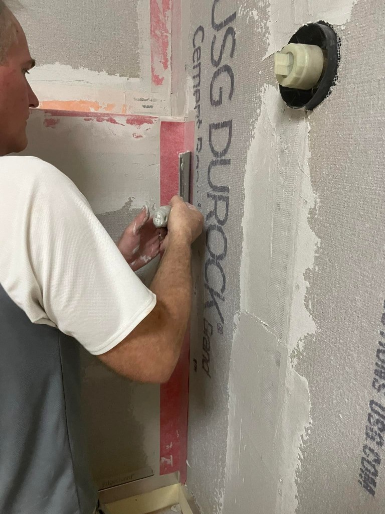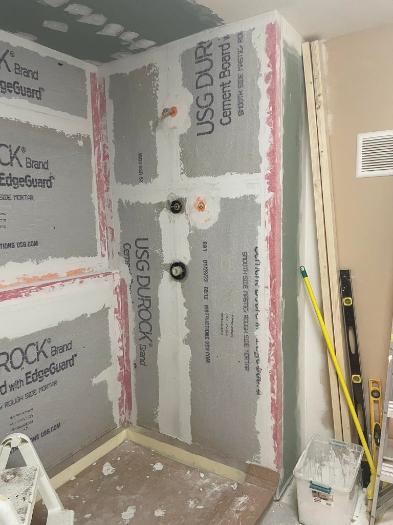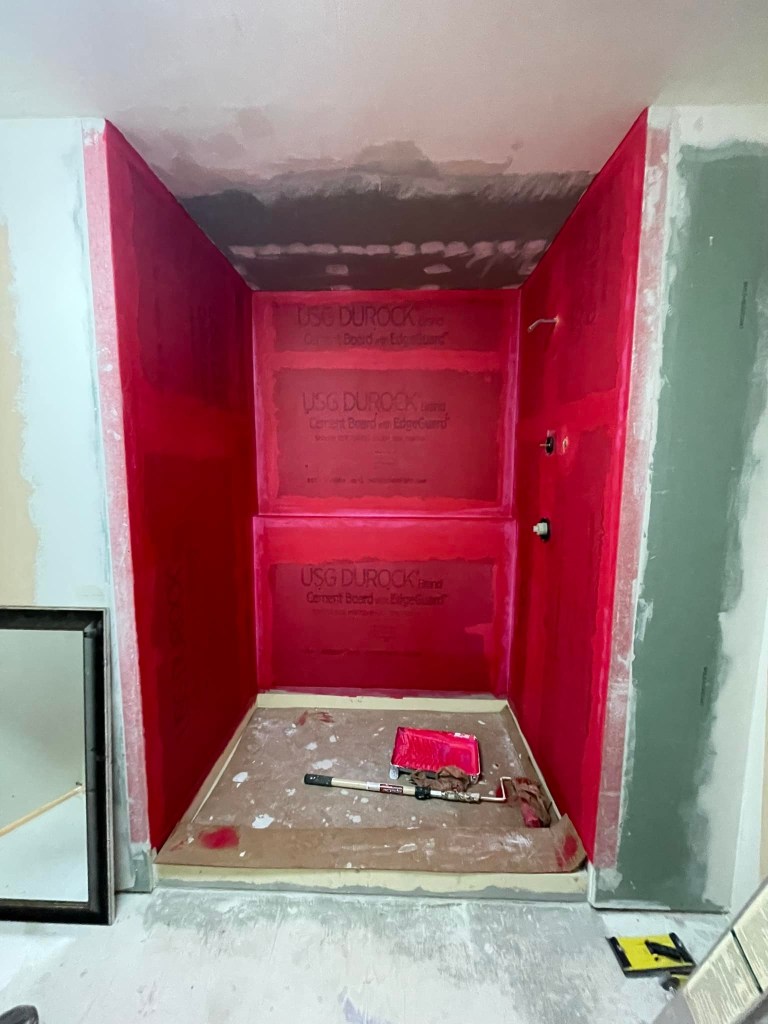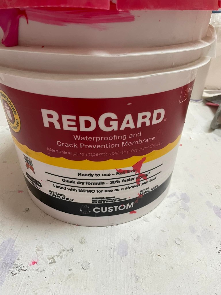 There are a number of ways to waterproof, but we are using a molded shower pan and flashing, Durock cement board, Kerdi water-proofing strip, and Redgard waterproofing for all the walls. The waterproof shower pan will ensure proper drainage as long as you adjust it and level it before the mortar sets. Then we installed the flashing and Durock cement board. We used Kerdi water-proofing strips in the corners and on the shower ledge. Finally, we completed the waterproofing with two coats of Redgard, which is also great to prevent cracking of grout and tiles.