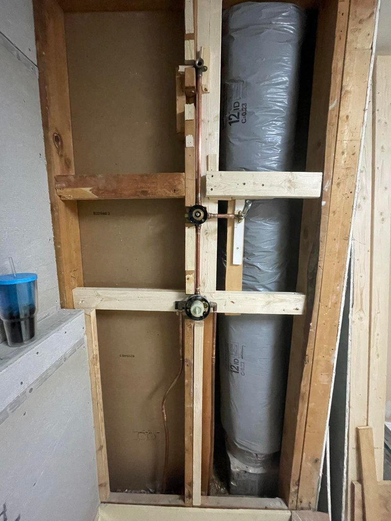 In the first picture below, you see the shower plumbing, which includes the hot and cold copper pipes, the internal shower control, hand-held shower wand diverter/piping, and copper piping to shower head. In addition to the shower, Jim had to move the plumbing for the toilet and double sinks. You will see the water supply for the toilet in the second picture below.