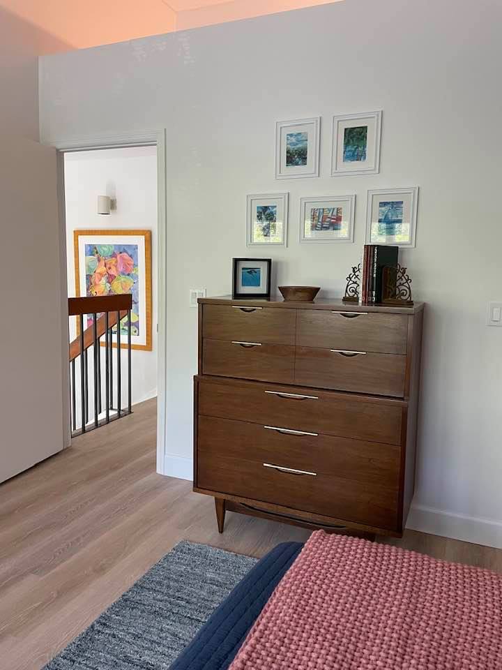 Using color is the least expensive and easiest way to modify the mood of your space. Adding a happy yellow or dramatic red to a space, creates an energizing vibe in a room. Whereas a relaxing blue or organic green creates a calm, relaxing space. You can add color with paint, including on walls, trim, and furniture, as well as colorful fabric and decor pieces. I recommend using the 70/30/10 Color Rule, which will help you bring color into all your spaces.