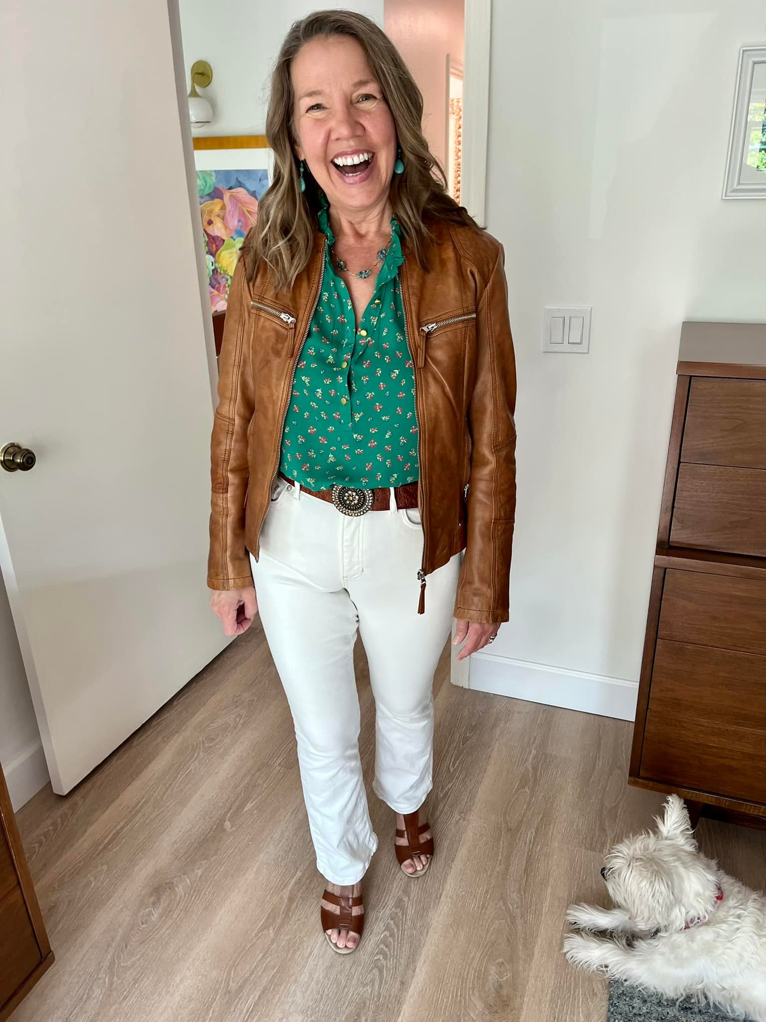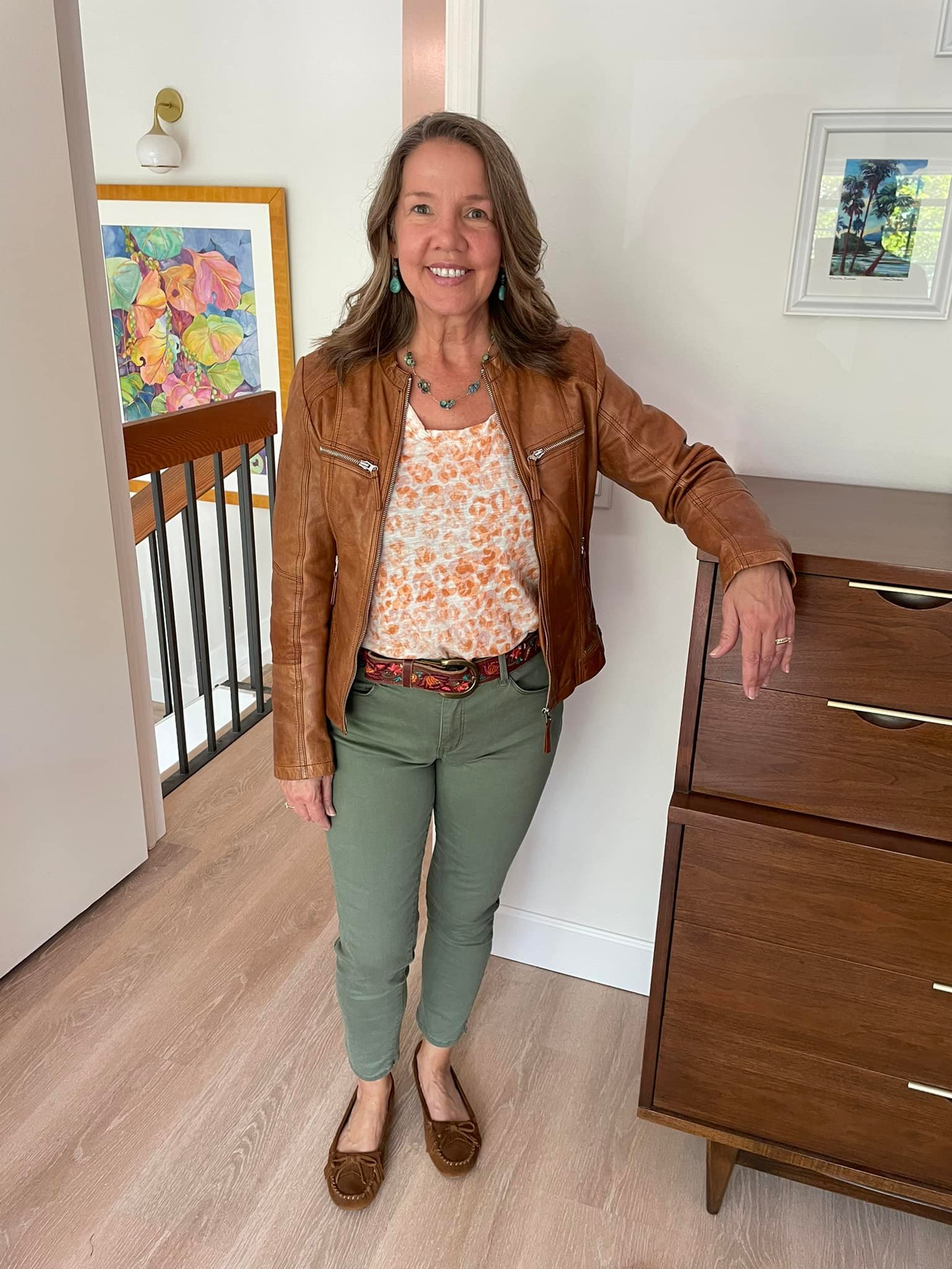 After speaking on the phone, I scheduled a time for Marcella to come to my home and analyze my existing wardrobe for fit, color and quality. During our session, she helped me identify my key pieces and created a shopping list for any missing wardrobe items. This experience was fun, informative and helped me dress for my curvy figure! For example, I never realized that I had a really high waistline, which means that high waisted jeans and pants are the most flattering for me. Marcella also put together some existing pieces to create new outfits. Here is one example below: