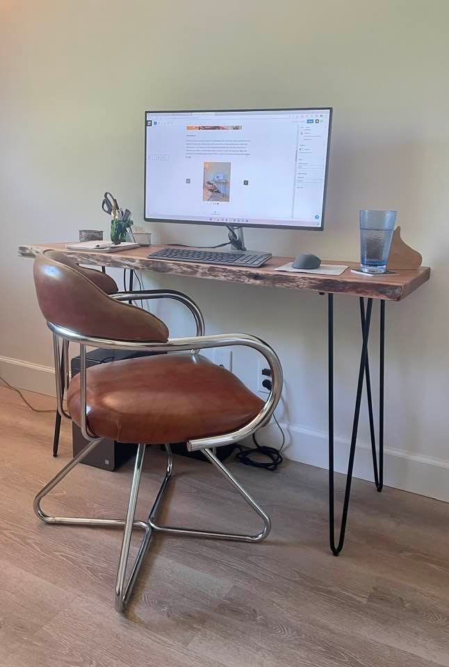 We use one of our three bedrooms as an office/den, which provides a place to work and a comfortable seating area to relax. I found a small, live edge desk with hair pin legs from HomeGoods that looks great and didn’t cost a fortune. The vast majority of the time, we will use this space as an office, but it may need to accommodate an overnight guest on occasion. We bought a gently used Natuzzi leather couch at True Treasures, which will make a comfortable bed in a pinch.