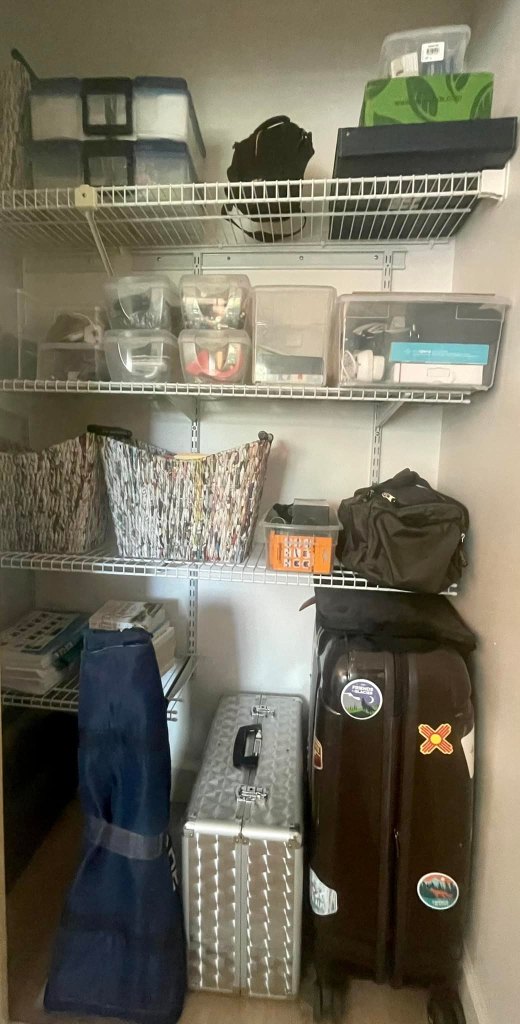 As you can see below, Jim designed and installed a Home Depot Closet system that works for our needs. About 80% of this closet is used to hide clutter and things we use occasionally.