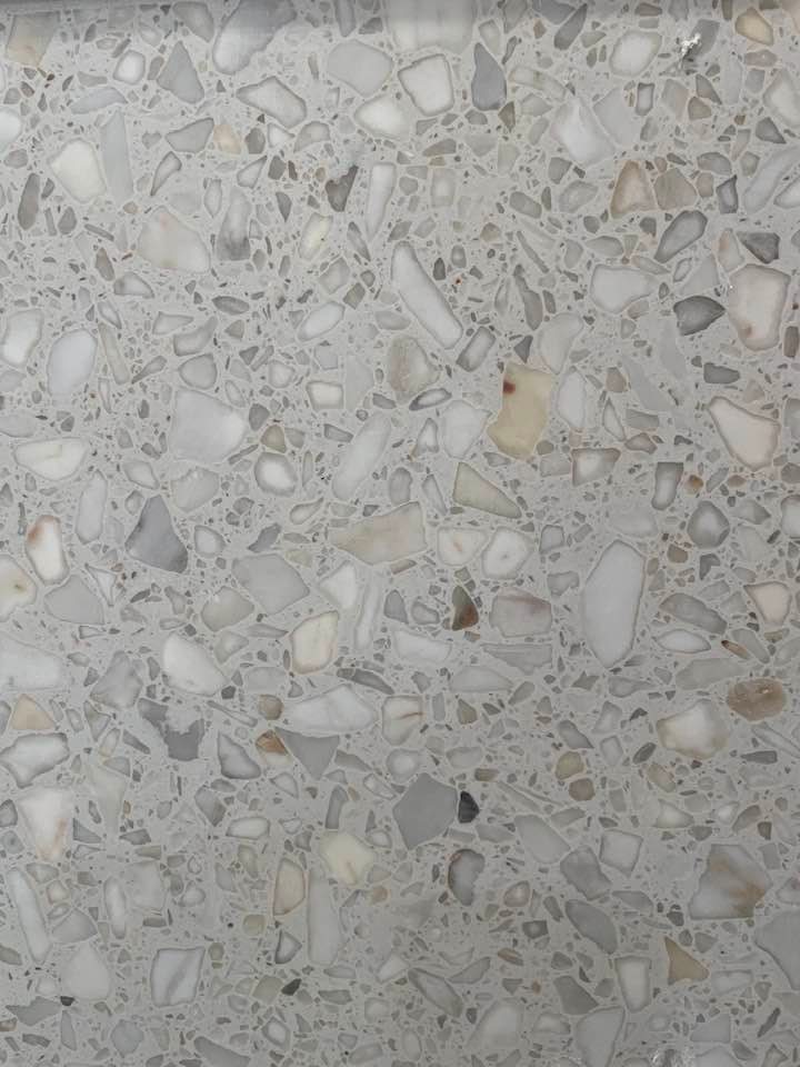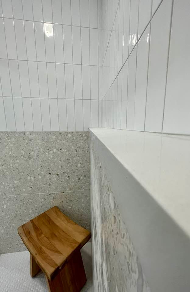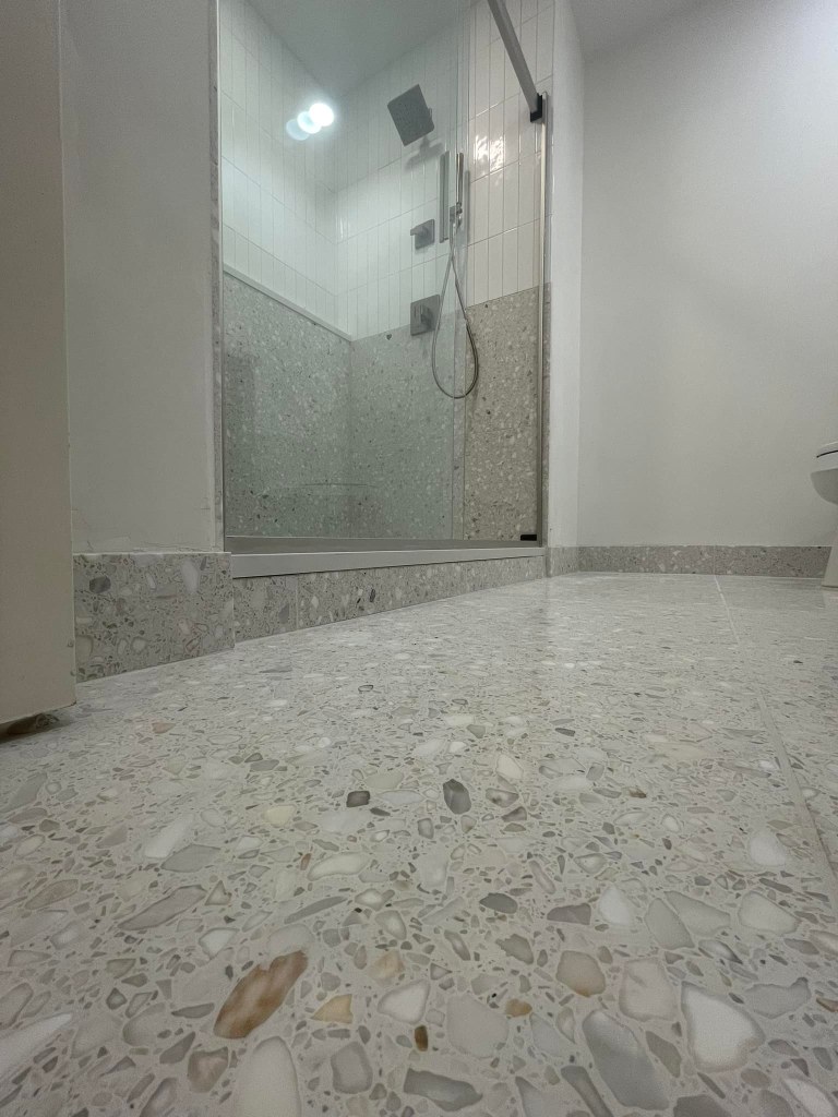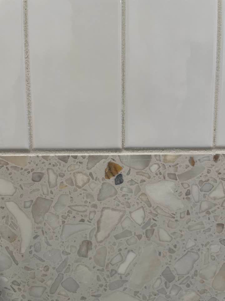The gorgeous terrazzo tiles have a beautiful mix of granite, quartz, shells, and marble in varying shapes and sizes. The neutral base looks terrific with the white, grey, black, and brown colors in this tile. It is definitely warmer than it looks in these photographs. The large 24″ x 24″ terrazzo tiles are durable, easier to install and will need fewer grout lines than a smaller tile. We used two different grout colors in this shower, white grout for the Habitat and ash for the Terrazzo. You can match a tile’s base color to a similar color grout for your tile job.