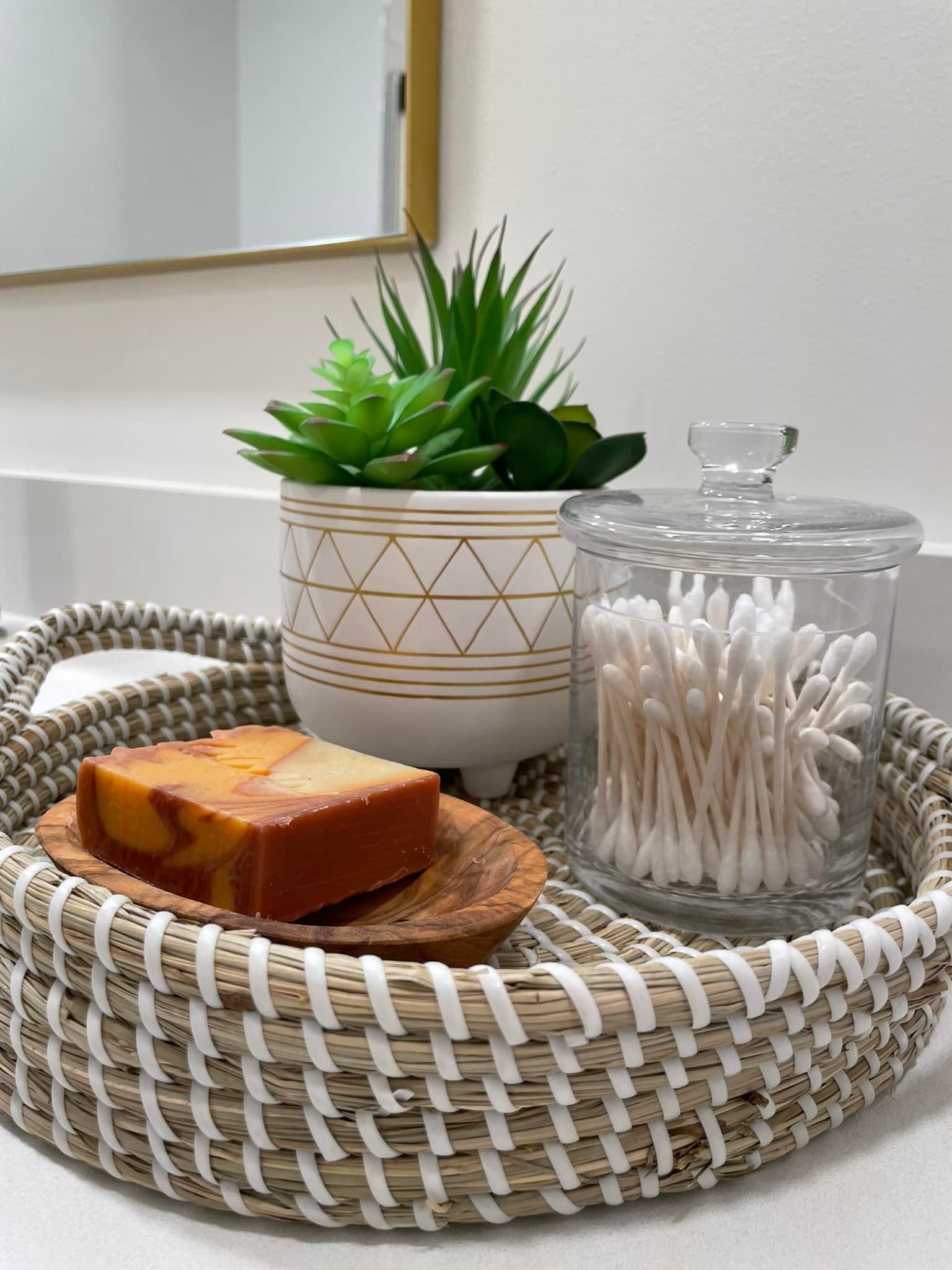 The large and stylish AllModern mirrors are hung 10″ above the sink. The vanity tray and faux plant came from Wayfair. We had the glass container, and a friend gave us the soap and dish. The funky rug from Ruggable is unexpected and fun. The neutral towels blend into the design.