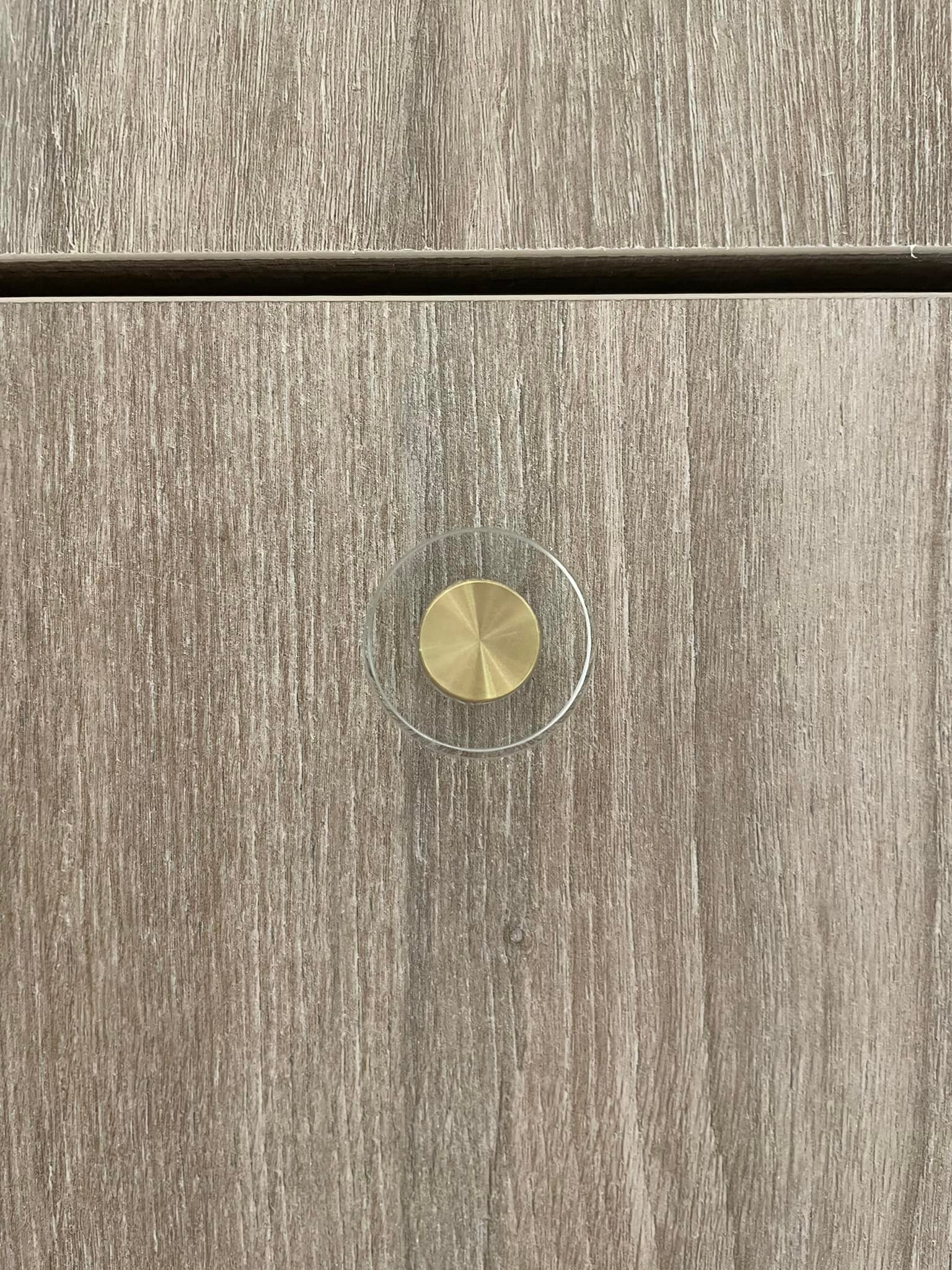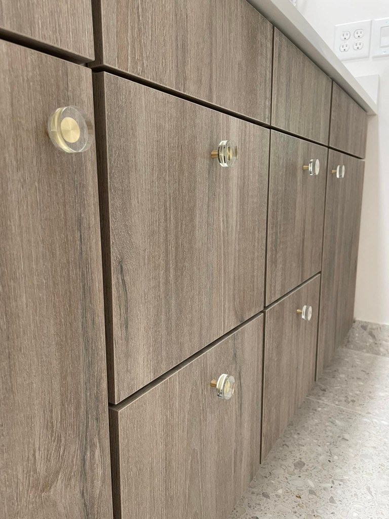 Removing a linen closet gave us room for a double vanity, which makes this bathroom functional for two people. Two sinks are a must for us, and the vanity also offers four drawers and two cabinets for storage. The modern flat panel cabinet doors are a nice contrast to the warm wood grain of these American Woodmark cabinets from Home Depot. They also compliment but do not compete with the terrazzo floors. The cabinet pulls have a touch of gold and came from Amazon.