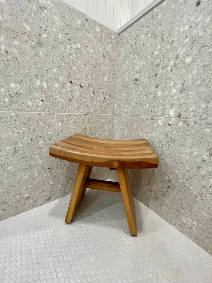 One of our biggest projects to date is finally complete! Our bathroom is bright and beautiful, but it also has the function anyone could want in a bathroom space. The exquisite tile choices are durable and timeless, as are the Moen plumbing fixtures. Indestructible white quartz from Plast Design was used for the shower shelf, threshold, and vanity top. We prefer a small teak bench in the shower over a built-in bench for a clean look with easy maintenance.