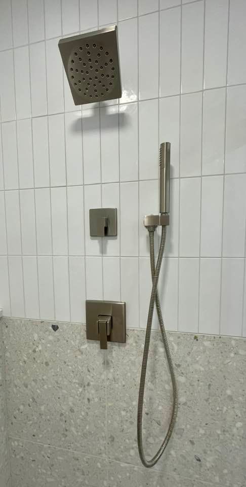The shower was oversized, so Jim was able to build out the bottom half of the back wall for a long shelf that holds soap and hair products easily. We installed the Habitat tiles in a vertical modern pattern that looks great with the terrazzo. The penny tile will prevent slips and feels great on your feet. The rain shower fixture has plenty of pressure for washing your hair but feels good on your skin. The handheld wand is helpful for shaving your legs and cleaning up. We found this glass panel shower door online with Home Depot. It was reasonably priced and opens on both sides via a barn door system.