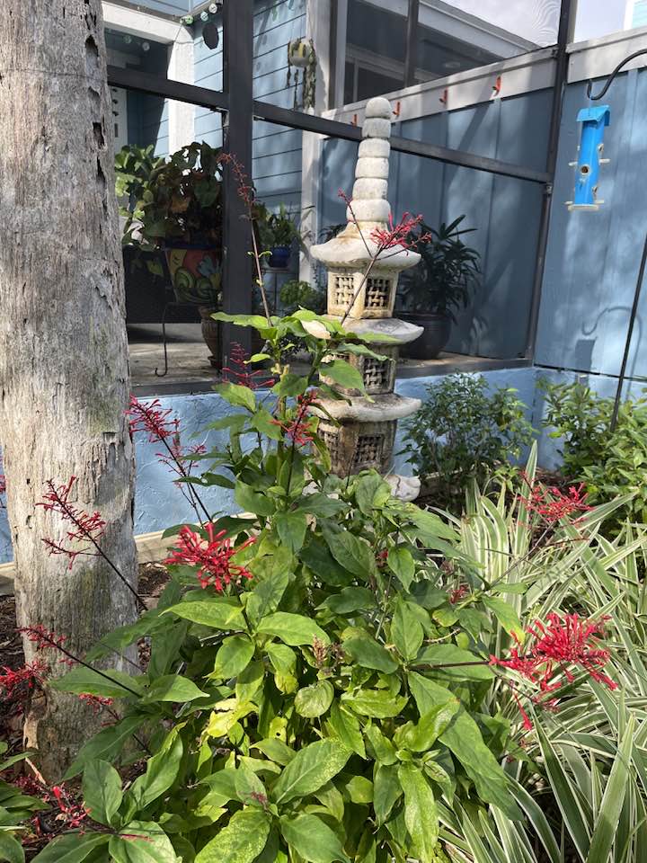 In addition to the natives, we planted a few non-native plants, including Flax, Red Firespike, and White Begonia odorata alba. Flax adds interesting variegation to the garden but is susceptible to Rust fungus, which we are treating with an anti-fungal spray. If we don’t see improvement, we will probably replace the Flax with Horizonal Cocoplum. The Red Firespike attracts butterflies all year and hummingbirds during the spring. Finally, we added two White Begonia odorata alba plants because we’ve had them in our last two gardens.
