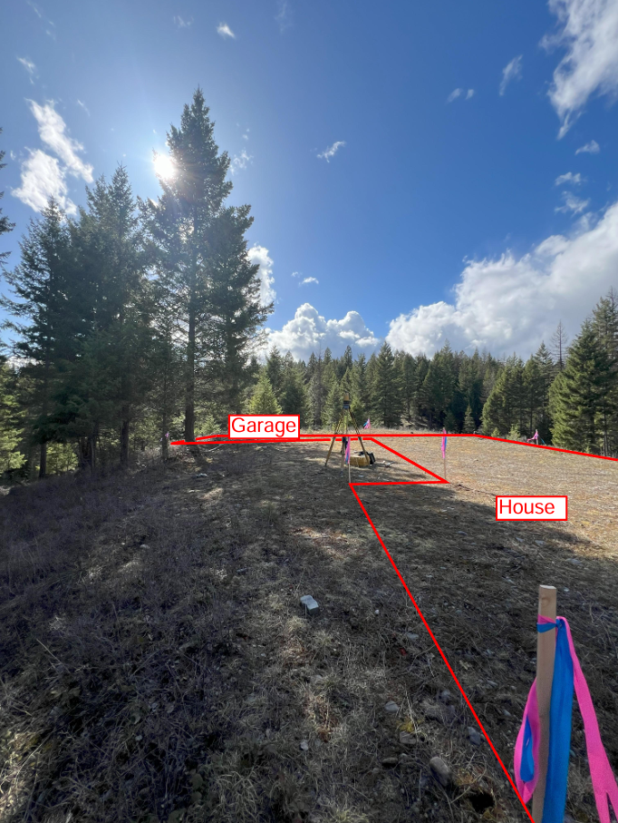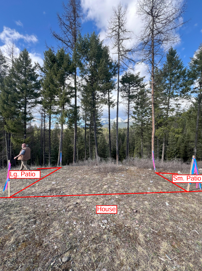 Our builder, Jason and excavator, Cody had done some preliminary site work, so their stakes were still up when we visited our build site. We got there about an hour before our scheduled meeting with J Martin Builders, so we had plenty of time to make sure this was exactly where we wanted the house built. We had our Sketchup rendering and Layout floorplan and used these to consider the views, sunlight, and driveway placement before our meeting. We are going to have awesome Swan Range Mountain views from most of our rooms, including our living, dining, office, primary and guest bedroom. We will have partial views from the kitchen because of the covered back porch.