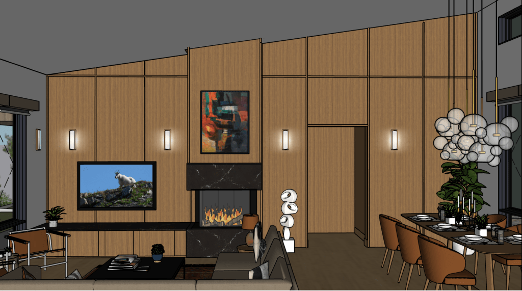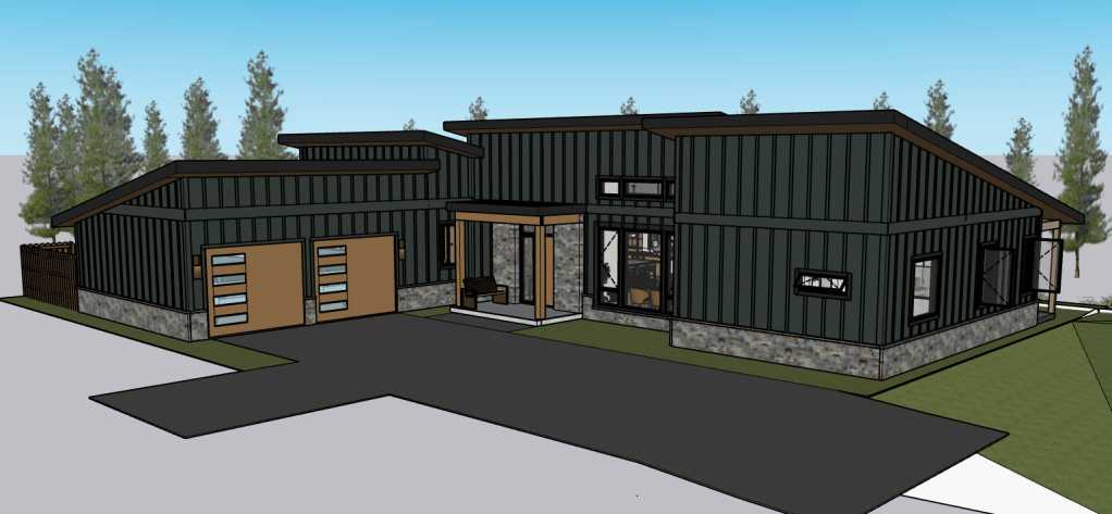 Jim used SketchUp to “build” the house starting with the foundation, walls, roof, and everything but the “pretty” stuff using SketchUp. Throughout this entire process, we discussed the design, including plenty of changes along the way. For example, we used SketchUp to create four different floorplans, including 3d Renderings. Our final design is the right size, just our style and has lots of big windows. It’s a little Jewel Box. Perfectly placed and when opened, it offers stunning Swan Range Mountain views.