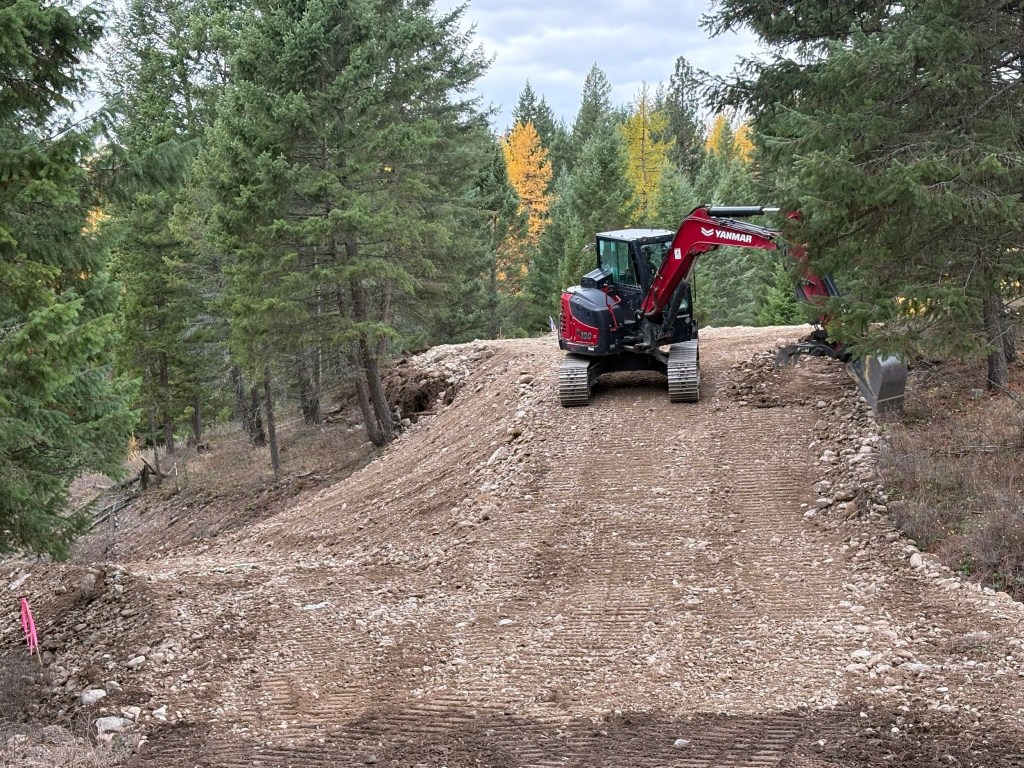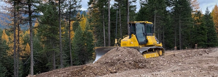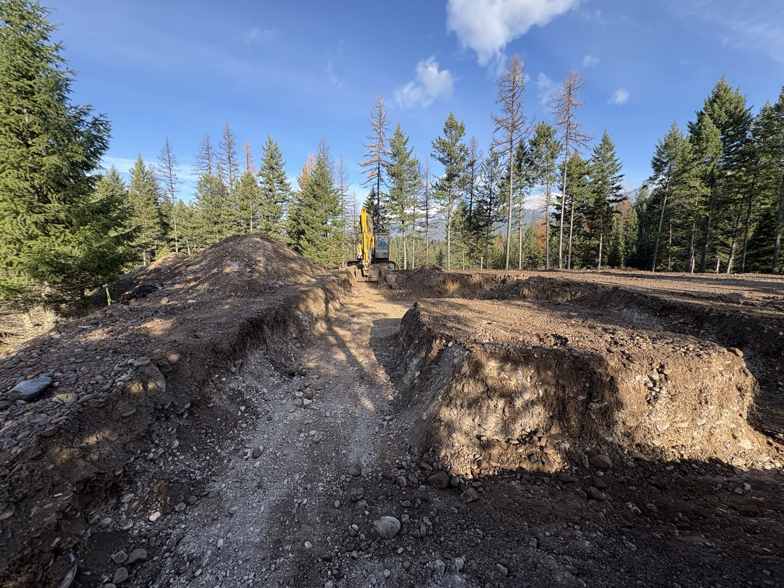 The first thing the excavator contractor, Glacier Construction did was use a Bulldozer to scrap the weeds off our road, driveway and build site. Our property is at the end of a community road, so we won’t have folks driving by unless they’re coming for a visit. As you can see from the picture below, we have a long private driveway. We’ll be responsible for maintaining and removing snow from the driveway.