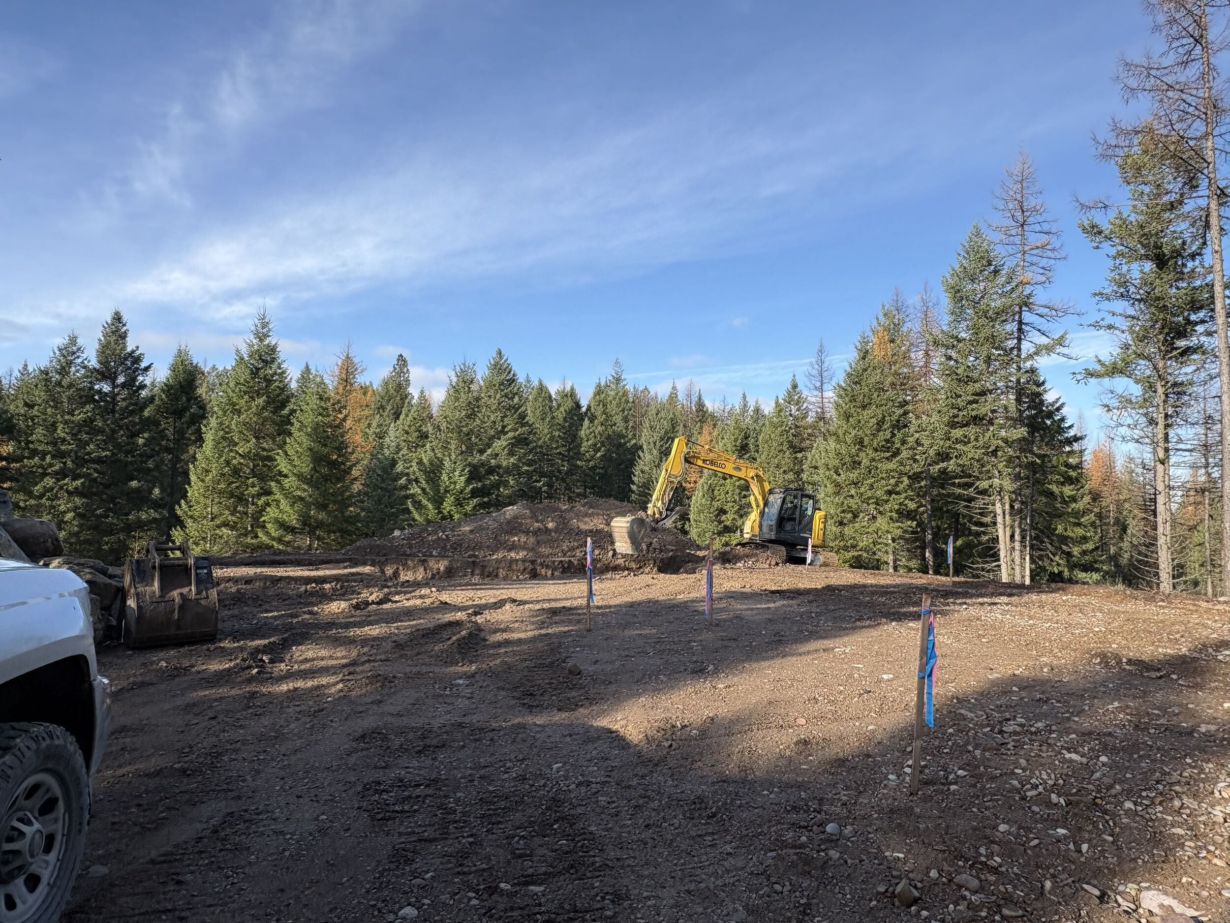 As you can tell, we have a lot of trees on our property. These trees are pretty, but they also can provide wind breaks. They provide food and shelter for critters and privacy for us. The gold pines you see are Western Larch, which turn gold and lose their needles in the fall. The site is now ready for the foundation dig happening this week.