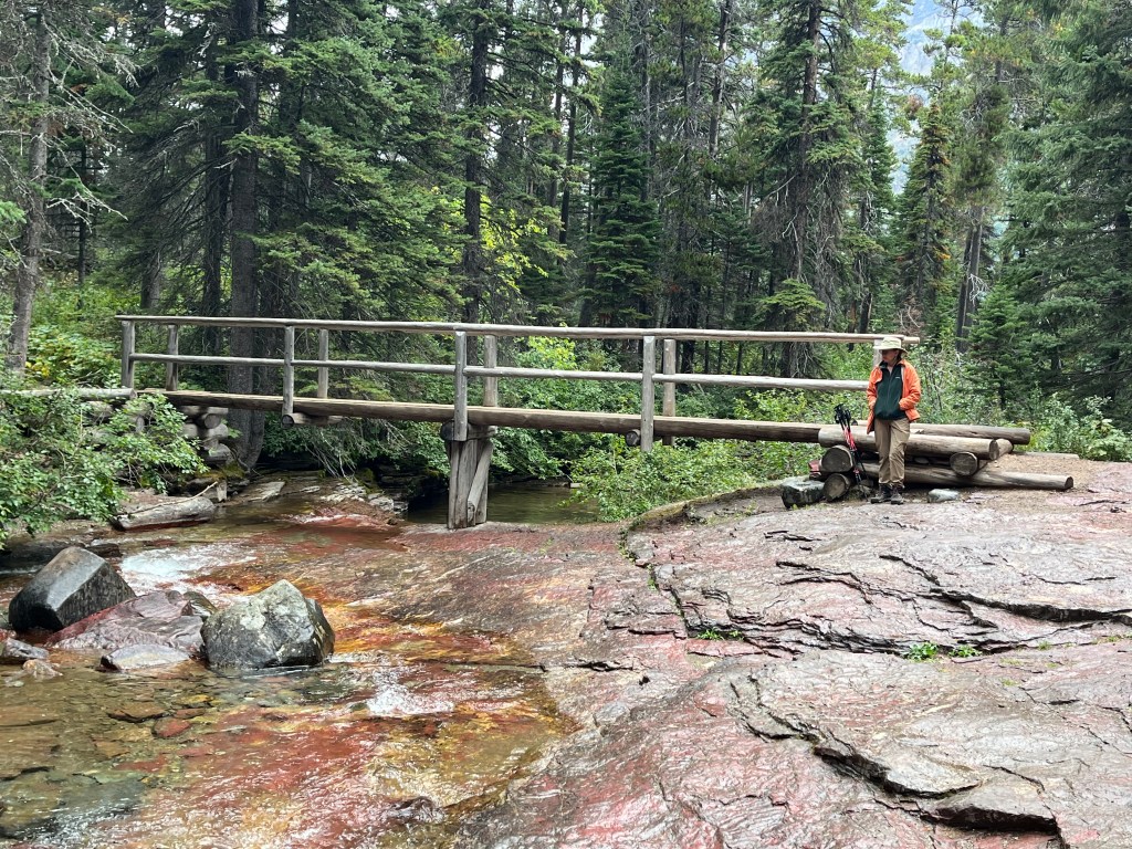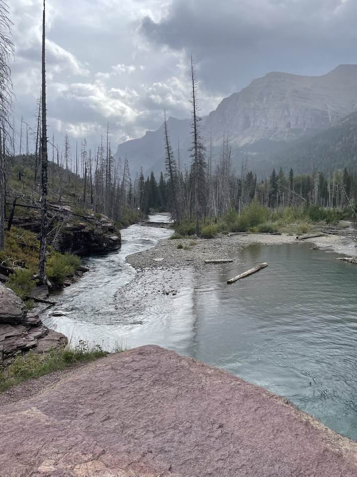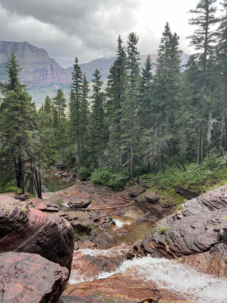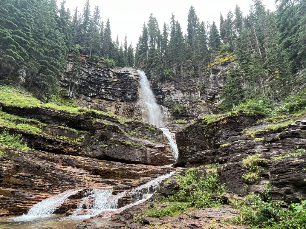 The day was cloudy and perfect for a walk among waterfalls. We did have short glimpses of sun as we traveled the trail to Virginia Falls (4.6 miles & 700′ elevation gain). You’ll have beautiful views of St. Mary Lake, and the falls are a gorgeous payoff for such an easy walk. You’ll see Baring Falls first, so be sure to continue on the trail to Virginia Falls.