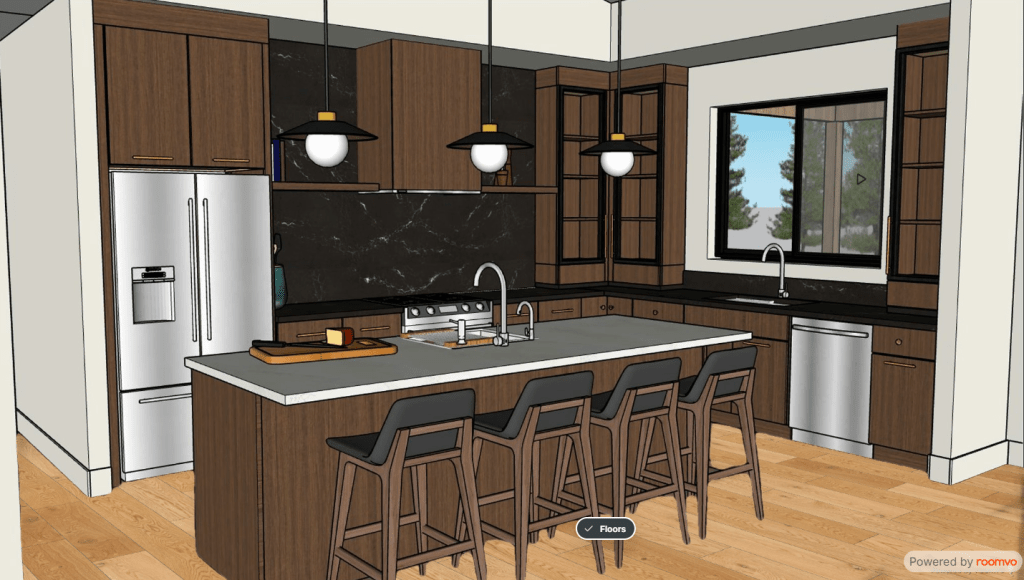 We are using SketchUp 3d Rendering to install the actual finish materials in our design. Unfortunately, sometimes colors and finishes online are not always accurate. Once we chose our cabinets, we tweaked our cabinets in the model to resemble black walnut. I then uploaded our rendering to the Johnson Flooring’s website to add our flooring selection. The picture below is what the website rendered: