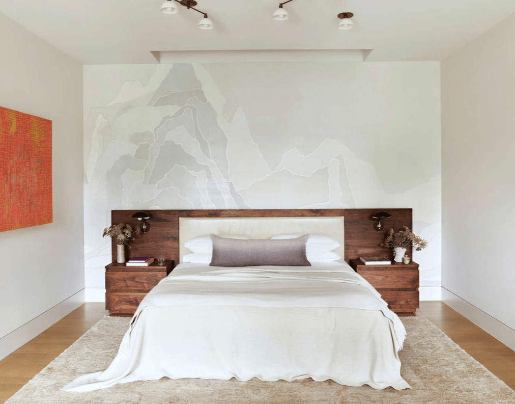 Your primary bedroom is a sacred place. One that should provide a respite from the busy world outside or even to get a break from the kids. I hope you’ll use the following tips to turn your space into a personal sanctuary that reflects your needs, routine, and things you love. Remember, it is important to take care of ourselves to be able to take care of others. For our space, we’ll continue our mid-century modern inspired design with white oak floors, walnut paneling, sconces, and simple, yet luxurious bedding.