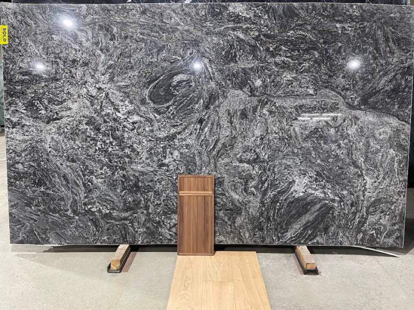 We’ve selected granite for our kitchen and fireplace surround for its durability, beauty and natural qualities. We decided against the quartz because it will change color when exposed to heat. We really wanted to match the kitchen counters and backsplash to the fireplace, so granite was the logical choice. We will be using Lava Vecchia granite for the kitchen counters and backsplash. The beautiful black granite has gorgeous movement with white veining and subtle warm brown accents. It’s actually lighter than the Cambria Delamere brown-black quartz we were considering. As you can see below, the Lava Vecchia granite looks great with our DeWils Walnut cabinets and Johnson engineered oak flooring.