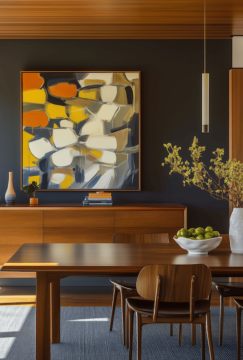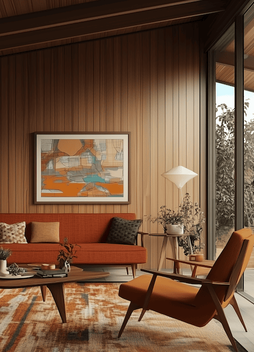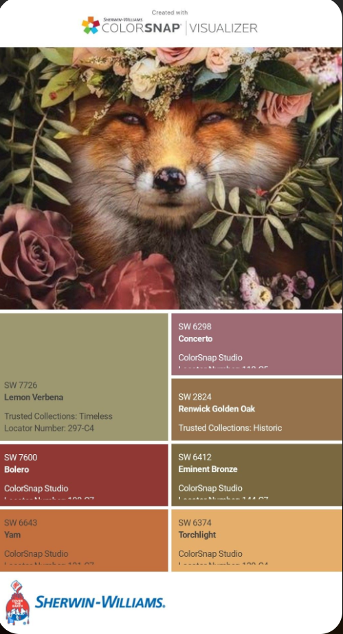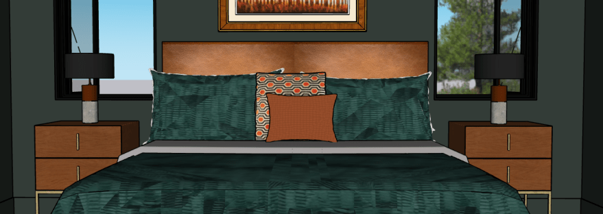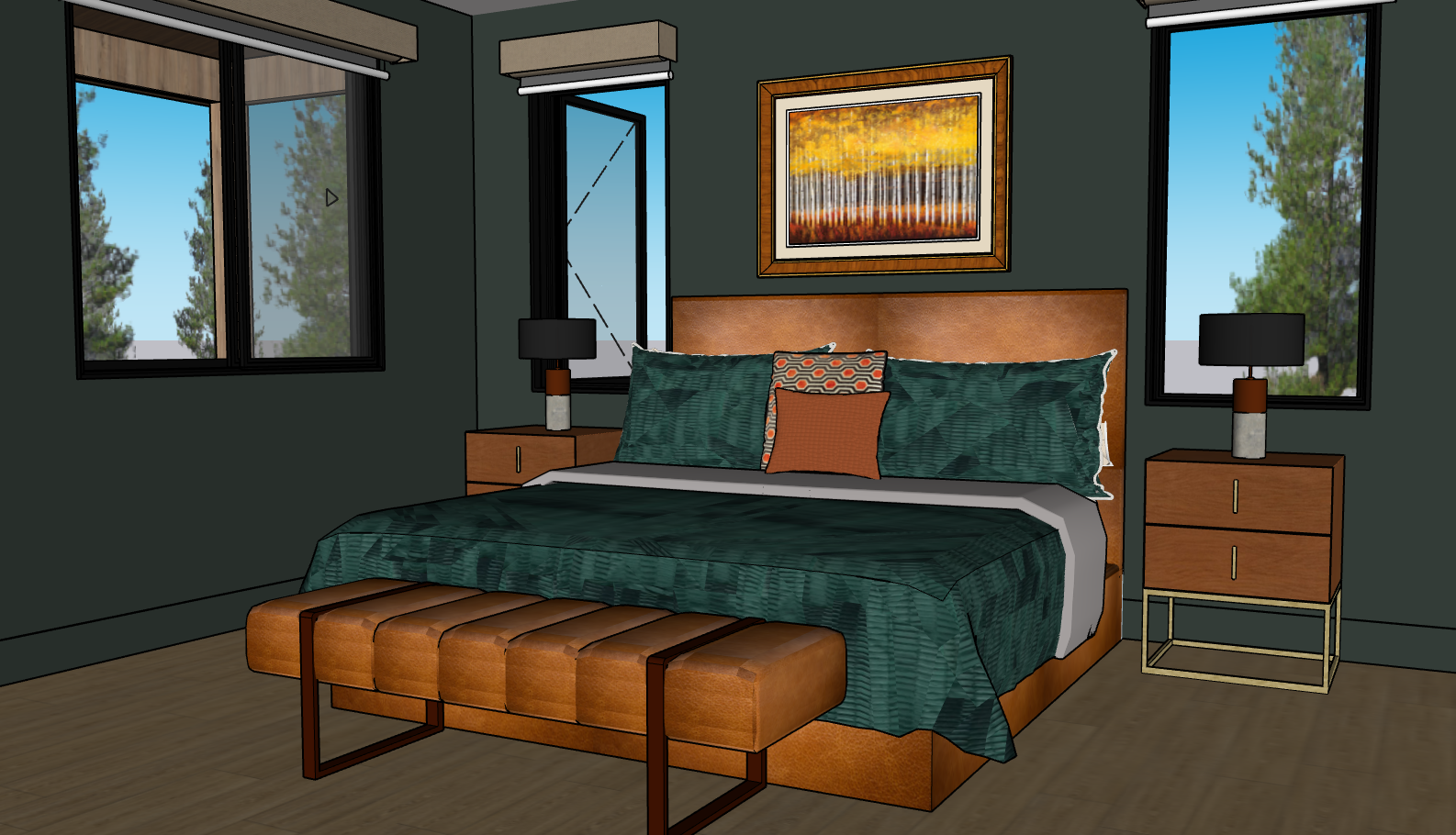 Love this take away from The American Society of Interior Designers’ (ASID) Trends Outlook Report for 202, “Joyful designs use playful shapes and bold colors to reduce stress and enhance mental health. Fractal-inspired patterns and color drenching are trending for their psychological benefits.” Our joy comes from the mountain views, Mid-Century Modern touches and color. I’m leaning towards deep, moody colors like Sherwin Williams Jasper, as well as warm deep rusty oranges and mustard yellows. As you can see in the pictures above, I’m playing with color in SketchUp, but my goal is to create spaces that reflect the following color palettes and MCM style: