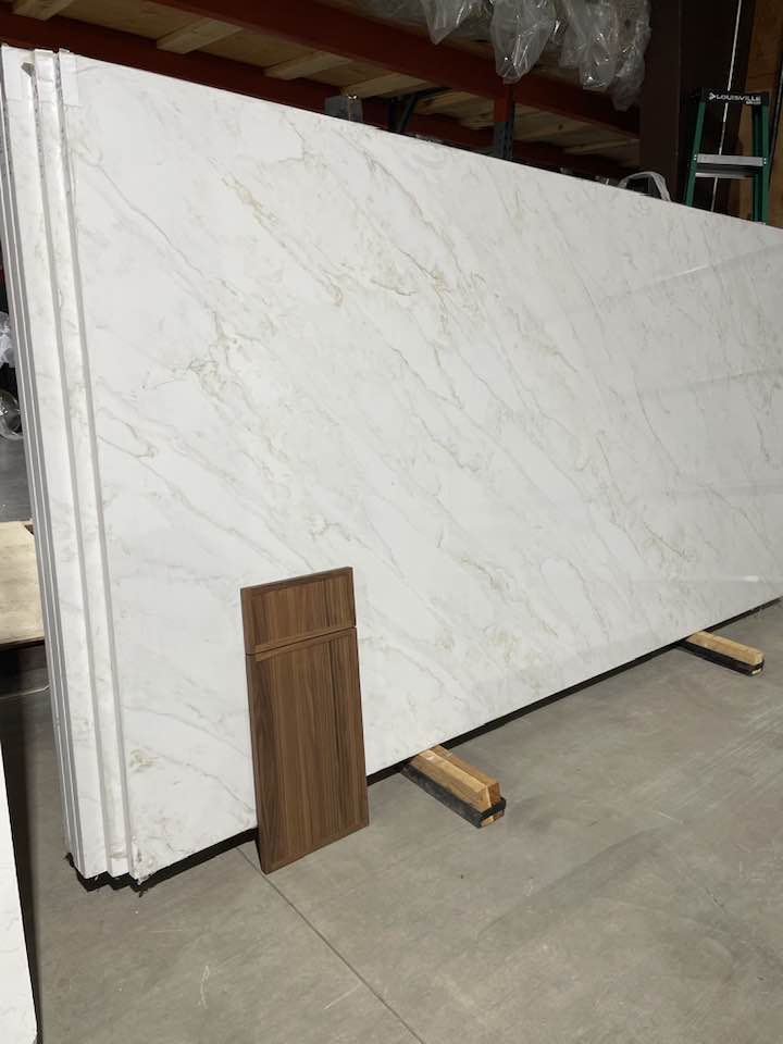 Chris, our builder’s representative at Cost Less in Kalispell also showed us a beautiful quartz that will work great for our bathrooms and laundry room counters. The Rhino Calacatta Royale quartz looks stunning with the terrazzo in the primary bathroom. The warm golden veining in the quartz also looks good with the tile we’ve chosen for the guest bathroom and laundry/mudroom.