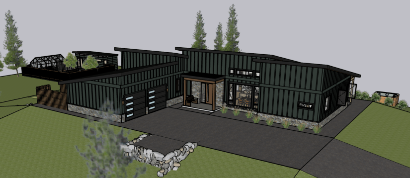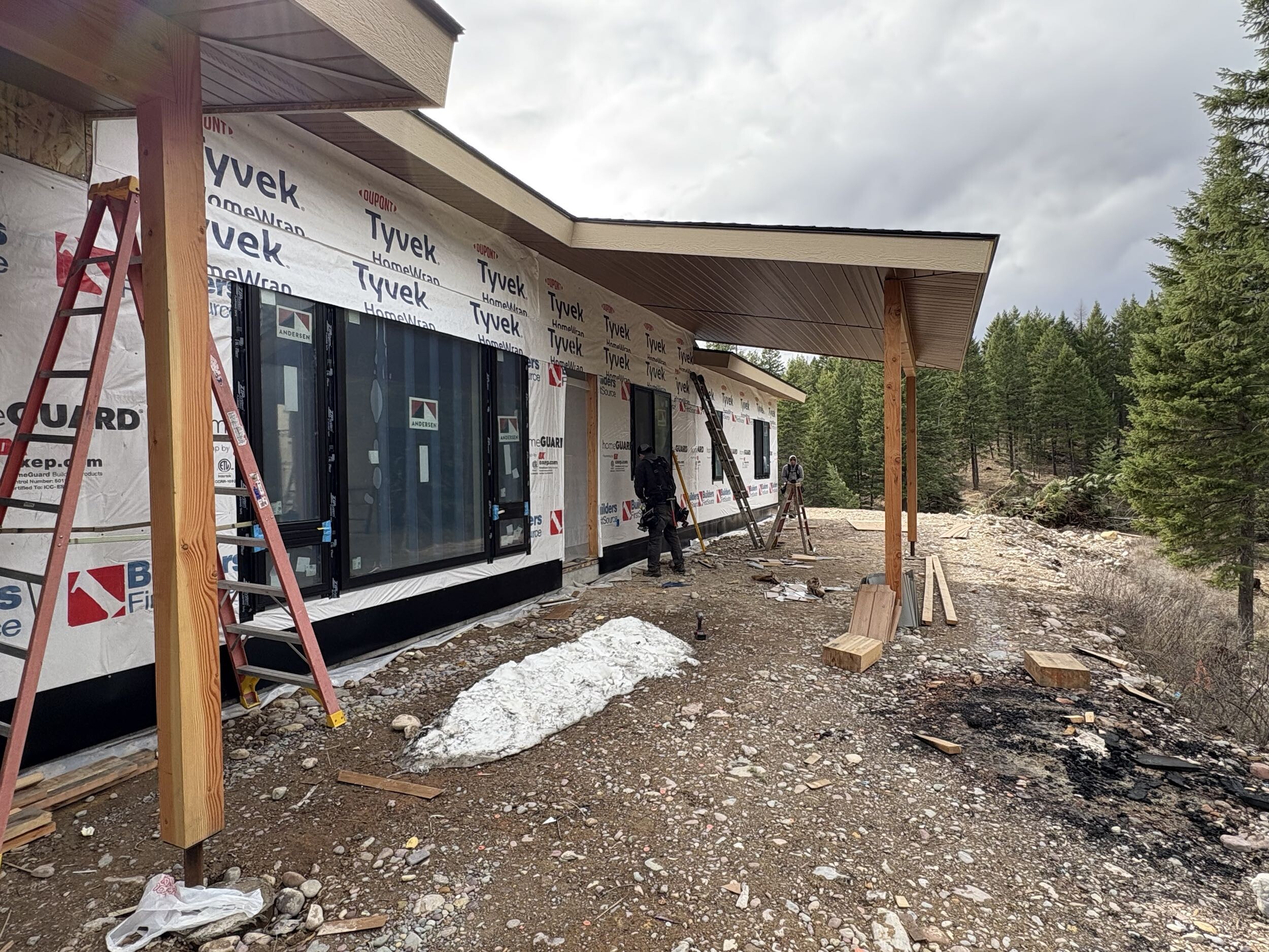 They’ll be putting up the LP board and batten siding next week. The siding will be painted Sherwin Williams Jasper and will look great with the black trim and black windows. We love the deep, green color which organically blends into the surrounding pines on our property. The fir front door, porch beams and posts will add a nice pop of warmth to the green and black. The natural stone veneer will add more contrast, and the stone adds a rustic touch to our Mountain Modern home.