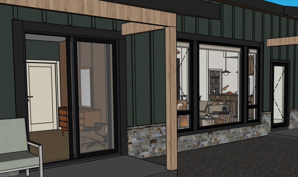 Alluvial leathered quartzite will be used for the kitchen island countertop, fireplace surround, and on top of the walnut TV cabinet. This quartzite provides the perfect amount of drama and natural, rustic vibes for our Mountain Modern home. Special thanks to Kate for finding these fabulous slabs!!! The black, grey and white in the Alluvial compliments the walnut used throughout the great room. It also ties into other black elements in the kitchen, as well as the black Anderson 100 series windows and doors. The Alluvial on the fireplace and top of TV cabinet looks great with the walnut in our SketchUp rendering: