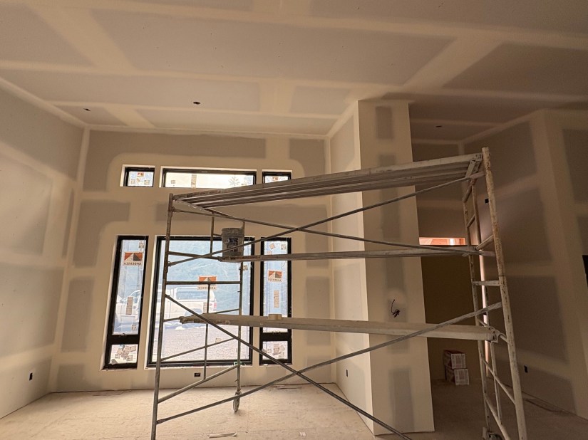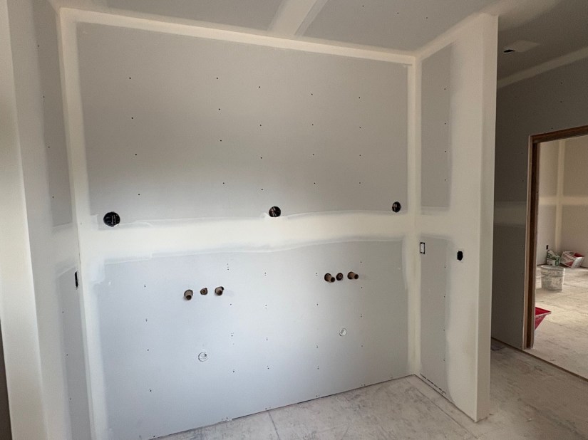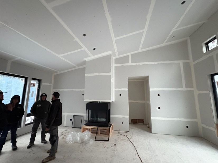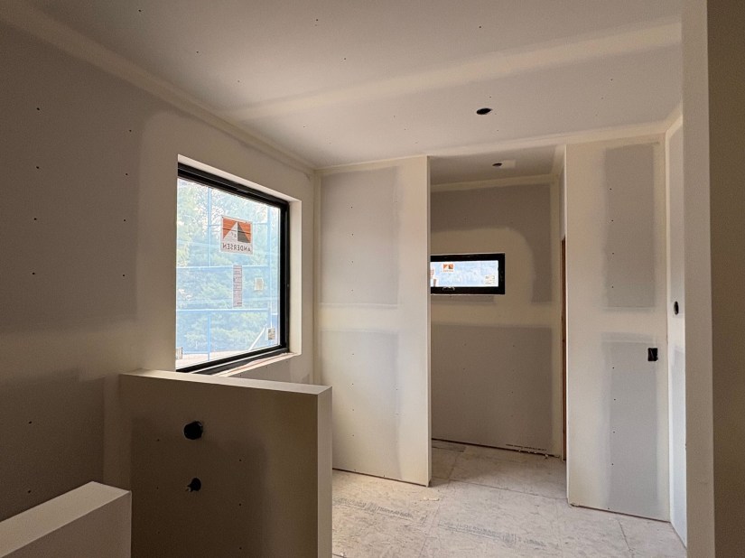 Now that they have some heat, the subs have started joint compound and will finish up the drywall in two weeks or so. As you can see from the pictures, investing in two 11′ x 7′ window openings and other large windows throughout the house makes our space bright even in the winter. You’ll also notice our propane fireplace has been installed. We’re adding a low, built-in walnut cabinet just to the left of the fireplace. The TV will go above the cabinet in the living room.