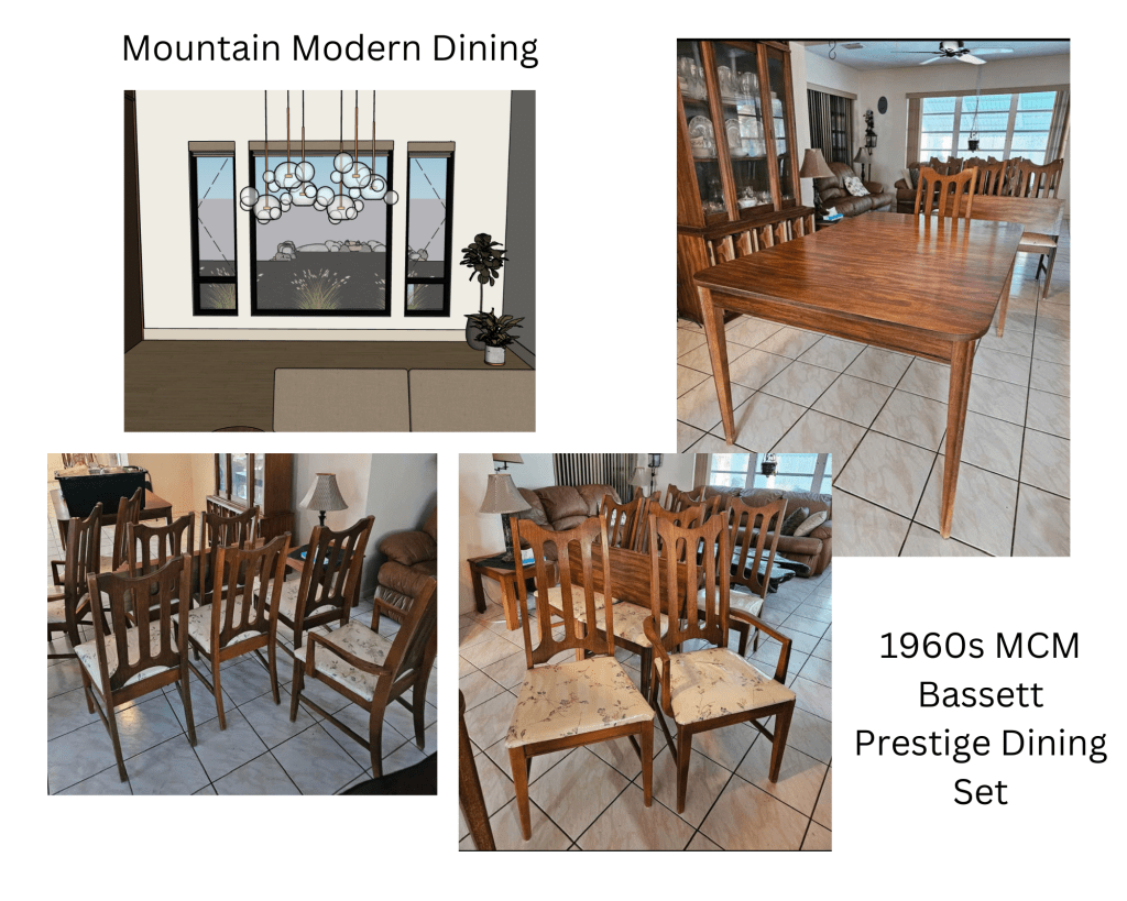 Selling our Florida home for a good price allowed us to add a few items to the builder’s scope of work; walnut paneling in great room, closets, and a floating walnut bench at the entry. The sale also gave us a decent budget for furnishings and decor for the new house. Many of our furniture, art and decor pieces are staying with our So Florida beach house, so we’ll need to purchase quite a few items. I love a collected home, one that exudes warmth and charm. I promise you won’t get this look by buying everything at a furniture store or big box retailer. The trick is to mix vintage and new pieces, i.e., our Kent Coffey MCM high boy and dresser with a new leather and wood bed from Wayfair. We’ll probably end up with a 40-30-30 mix of new, existing and vintage furnishings in our Mountain Modern home. Below is another example we’re considering for the dining room: A 1960s MCM Bassett Prestige Walnut dining set from Facebook Marketplace, a modern Bubble chandelier, and a really cool art feature.