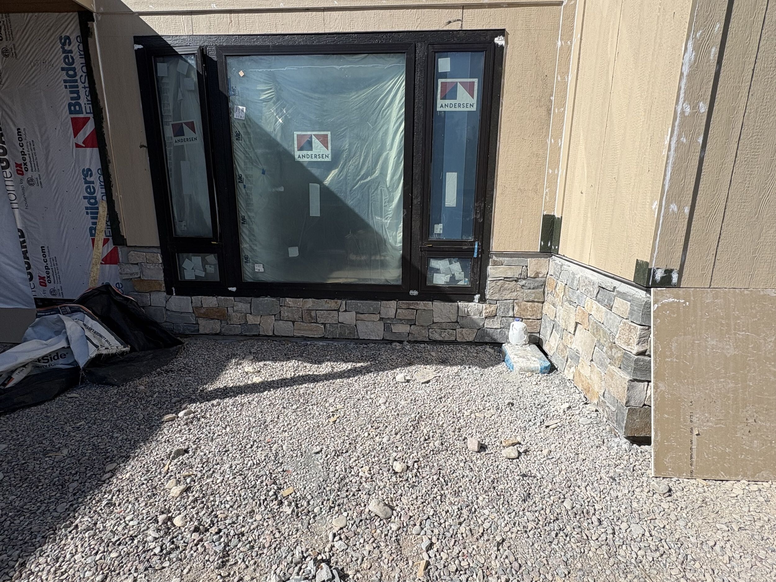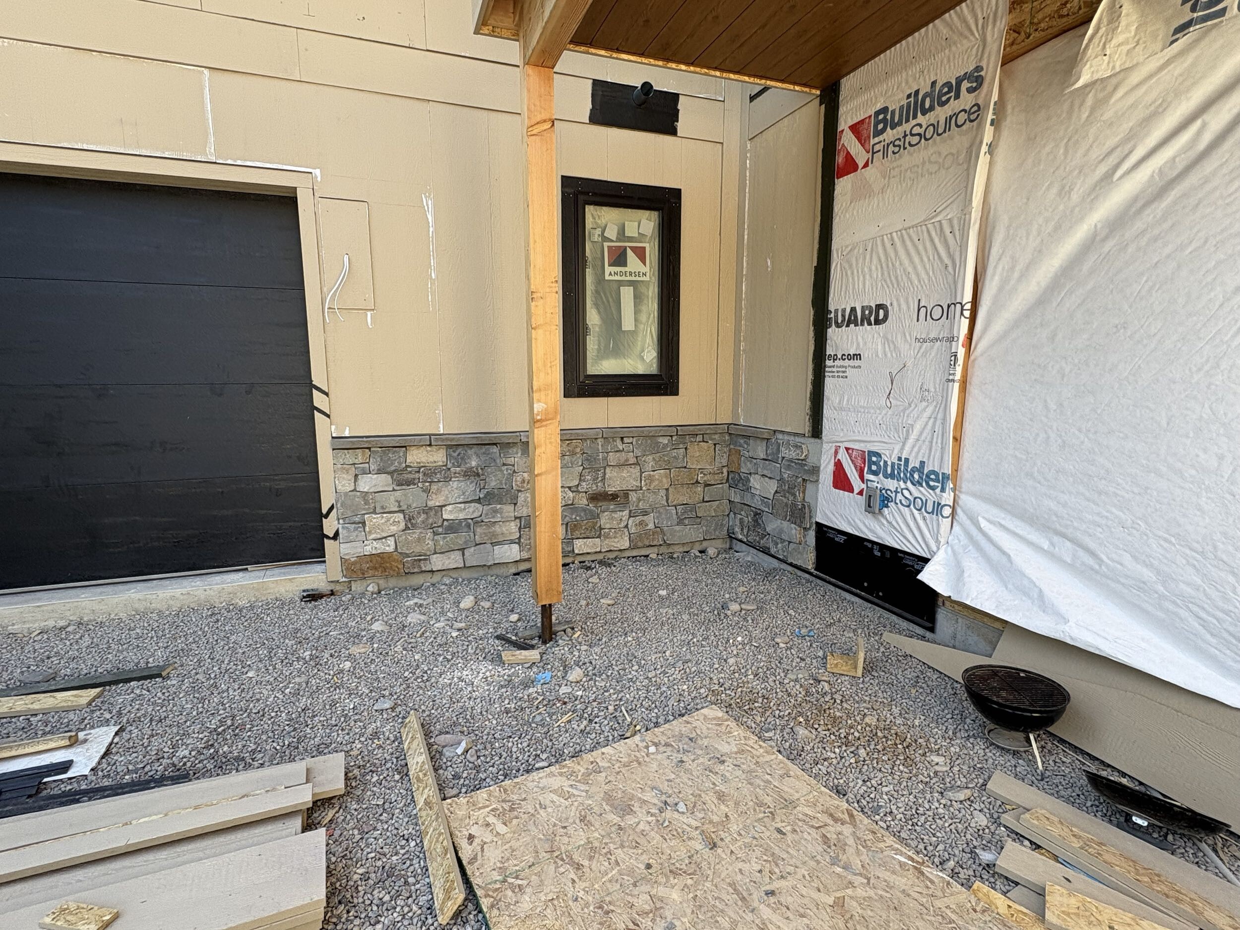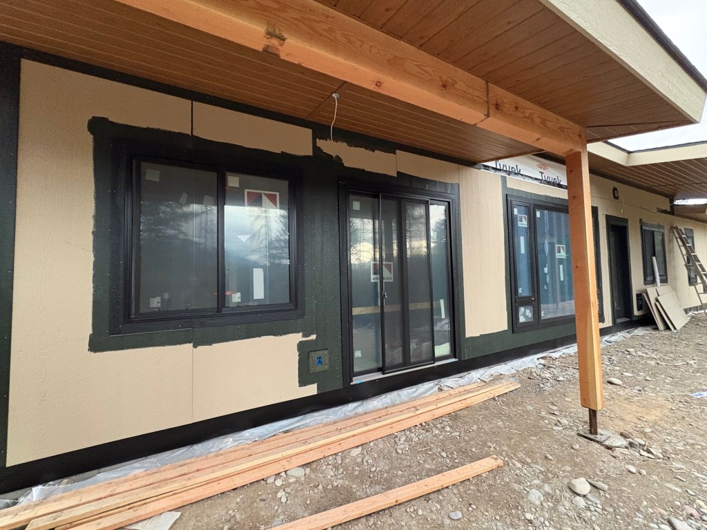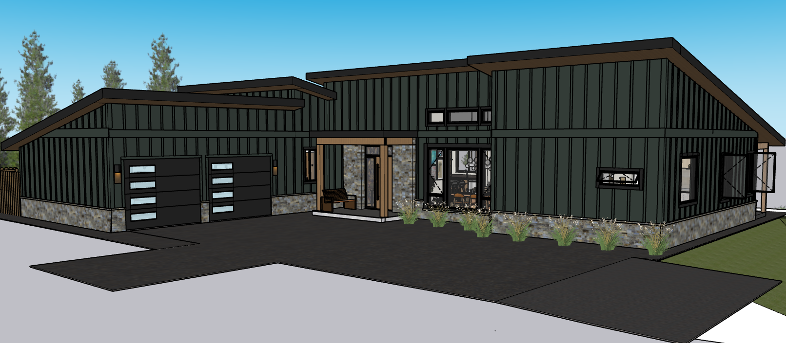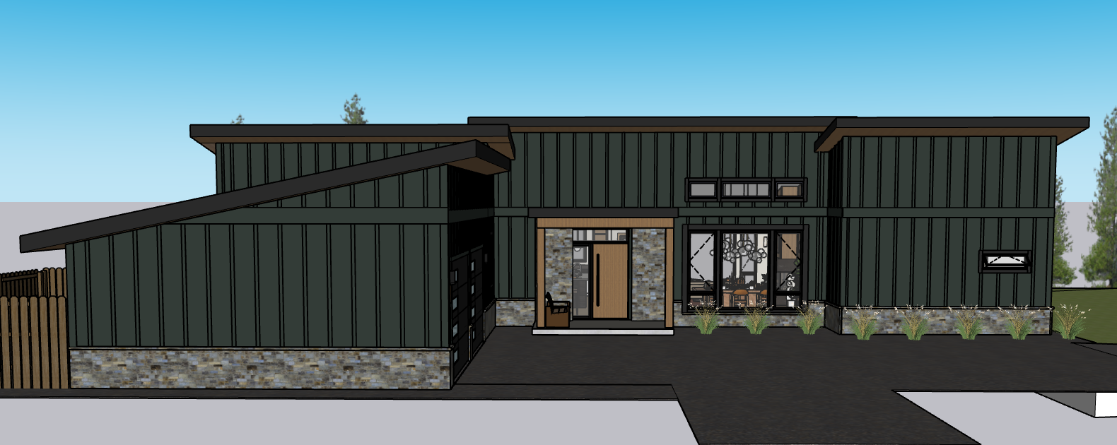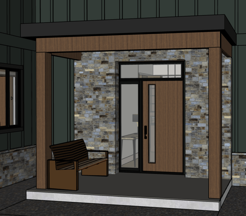 The natural stone serves as an anchor, grounding the home in its surroundings. Stone is an essential material in mid-century modern architecture because it adds texture, durability, and a sense of permanence to the design. The stone and wood on the porch posts and beams, as well as front door will add more natural elements, which are crucial to our MCM design. The wood and B & B siding balances the modern feel of our dark Jasper paint by Sherwin Williams.