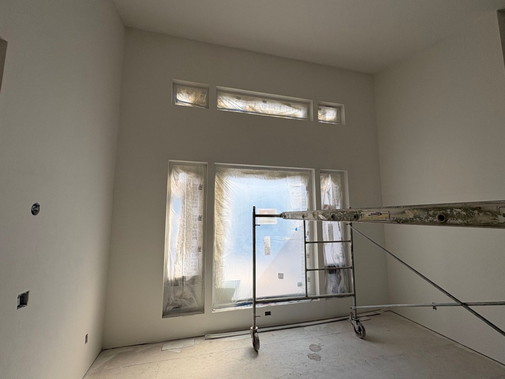 In addition to the exterior work, the painters have primed and applied the first coat of our interior paint color, Greek Villa by Sherwin Williams. They’ll be back to add a second coat of paint once the house is near completion. Greek Villa is a warm white paint color that will help balance the cool light of our north-facing rooms. We’ll still get plenty of light, thanks to the 11′ by 7′ windows in the dining room and entry windows on the south-facing walls. This paint color has the perfect amount of warmth with a soft, muted yellow undertone. The LRV rating of 84 makes it on the bright side of paint colors which will bring brightness to our rooms. Y’all, do you know how many white paint colors there is in the world? A lot! This website has some of the best descriptions and coordinating colors for all kinds of Sherwin Williams and Benjamin Moore paints: