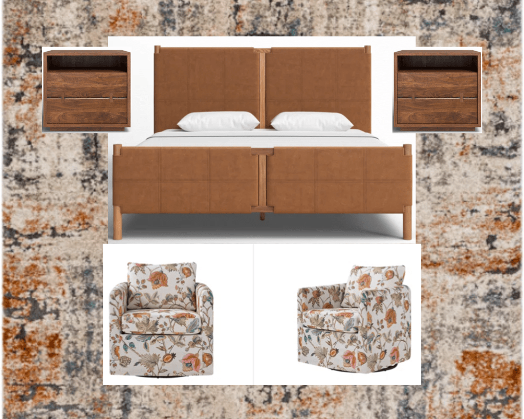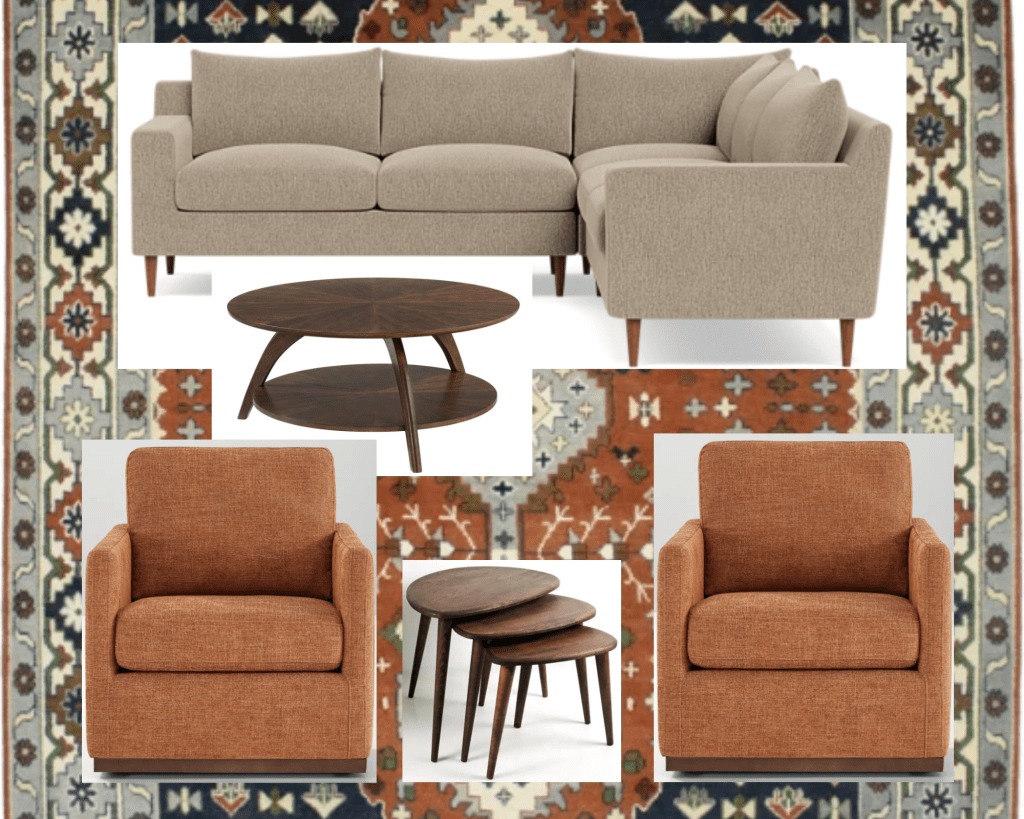 In the photos below you’ll see some of the pieces that we’ll need to replace, including a sectional, lounge chairs, bedroom furniture, rugs and more. We’re loving the combination of walnut with some beige neutrals, as well as deep orange and green for our color palette.