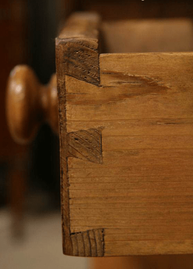 To make sure a wooden piece was made by a craftsman and is not a mass-produced piece, look at the joints and nails. If the nails are older and dull that’s a clue that they are probably original to the piece. If there are dovetail joints that’s a sign something was carefully made. In modern furniture, you’ll want to ensure dovetail joints are not rough or messy.