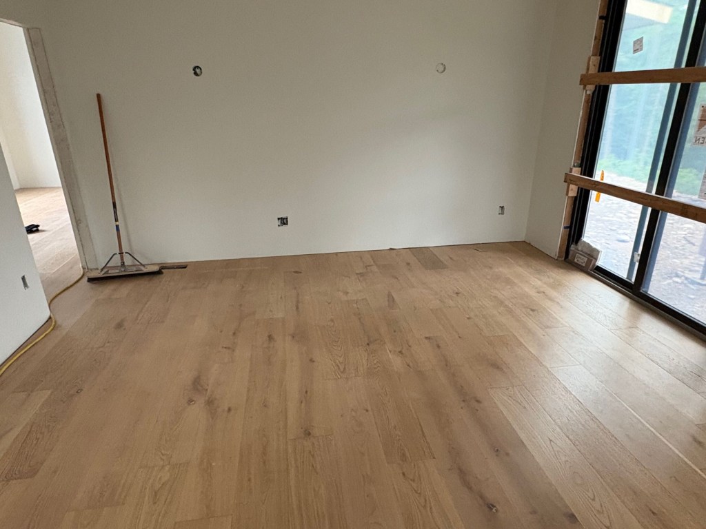 The Johnson Flooring’s wide engineered European white oak floors look really good in the house. These floors feel really nice underfoot and the aluminum oxide coating makes them more durable than onsite finished wood floors. They complement the Sherwin Williams Greek Villa wall color and keep the space feeling bright and open. The floors will be a gorgeous contrast to the walnut cabinets and other walnut elements in the home. The rural, mountain setting calls for natural materials, as does Mid-Century Modern design principles.