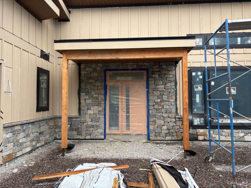 The stone subcontractor did an awesome job with the stone veneer. The stone looks great around the front door. It grounds the house to the landscape and having it rise up around the door gives the entrance presence. The wood on the door, porch beams and posts will be stained a medium, warm brown. The warmth of the wood will contrast nicely to Sherwin Williams Jasper. This dark green exterior paint will blend in beautifully with the nearby pine trees. Adding a couple of tall pots with plants on either side of the door and a welcome mat will finish off the front entrance.
