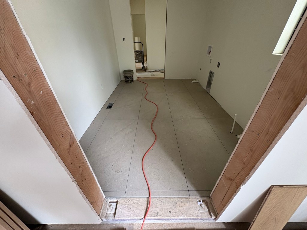 The tile guy has installed the porcelain tile in the second bathroom, mechanical room, laundry-mudroom. This neutral griege porcelain tile has a nice, subtle texture. It is also a nod to the terrazzo planned for our primary bath. This is a great example of how our Interior Design partner, Joni Stoll Designs helped us find something we really liked and saved us money.