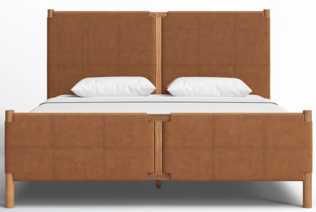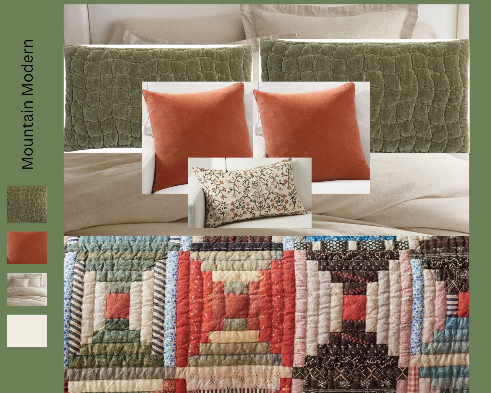 We continue the rusty red and green color palette in the primary suite. This room will be big enough for a king-size bed, so it is a great place to add color. The Pottery Barn Jaxson quilt fits our mid-century modern inspiration. The colors and pattern are perfect for this space. Next, I went with neutral linen sheets and a matching duvet cover. I pulled in the green and rusty red again with the shams and accent pillows. Instead of going with a set, I prefer to mix and match my bedding with different patterns, textures and colors. We really love the Pottery Barn bedding, gorgeous leather bed, nightstands and table lamps shown in the pictures below. Primary Bedroom Budget: $7,000