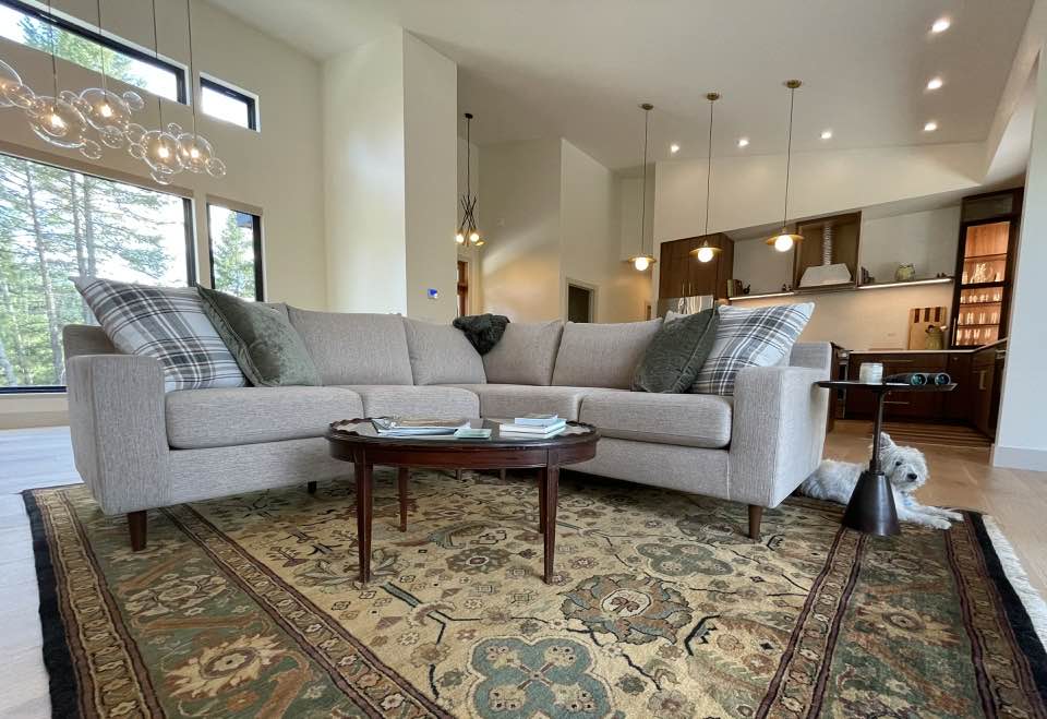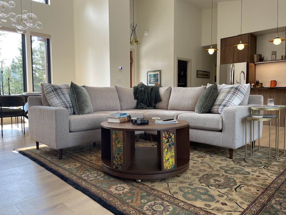 We are really happy with the Interior Define Sloan 4 seat corner sectional. This company allows you to fully customize your couch selection, including fabric, color, size, cushion type and filling, as well as leg options. Be sure to order samples to see and feel the fabrics you are considering. The back of the sample also describes the type of fabric, cleaning code and rub count. After visiting the Seattle showroom, we ordered the sectional in Field chenille fabric. The chenille is soft but should wear really well. I also went with individual cushions, which allows you to rotate and turn them helping them wear evenly. I prefer a cushion that doesn’t need fluffing, so the cushion filling we picked is perfect. Finally, the walnut legs tie into the other walnut elements in the house.