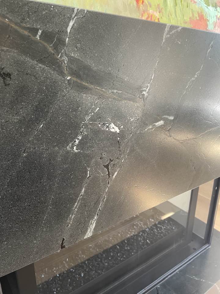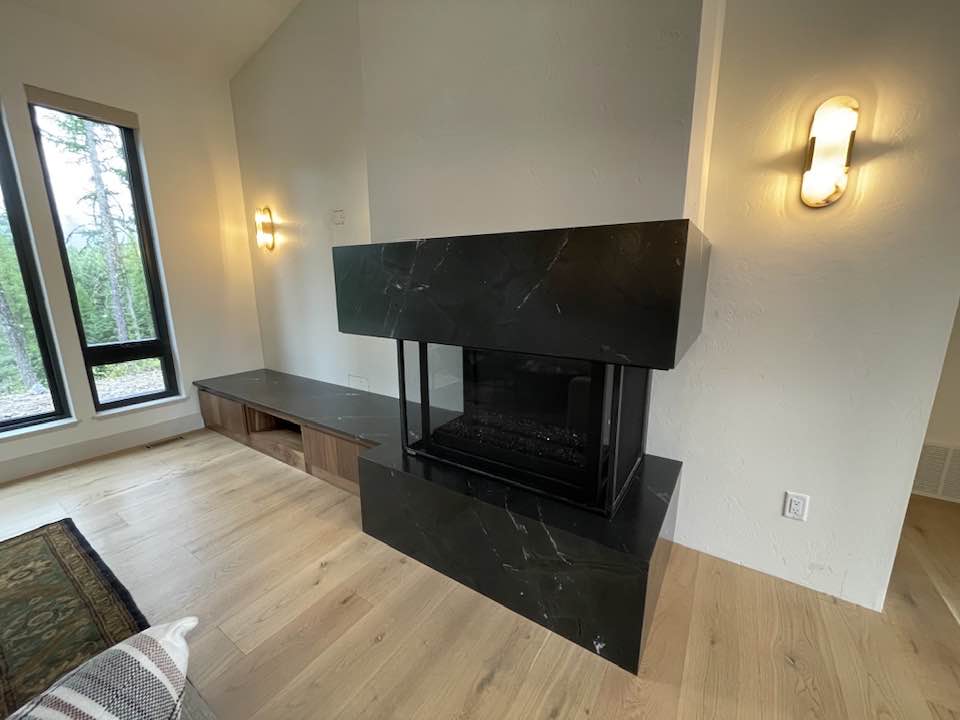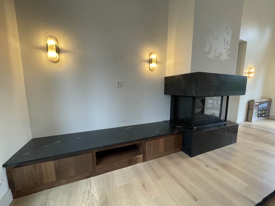 We are absolutely thrilled with the Alluvial quartzite we used around our Montigo three-sided fireplace. After installing it, Serg (stone installer) called it a “piece of art.” I think he meant his handiwork, but we think it is pretty great too. We used the same quartzite on top of the TV cabinet and on our kitchen island, tying everything together. Once the walnut paneling is installed on this wall, the TV will be mounted above the cabinet.