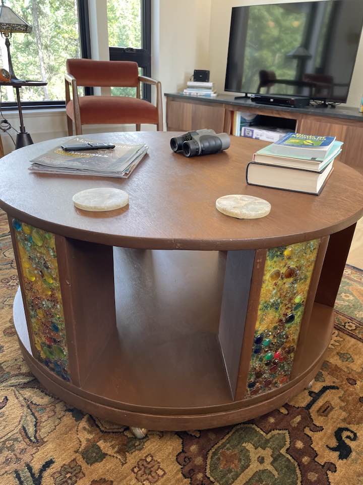 I found this 1970’s walnut and colorful glass inlay coffee table on 1stDibs. The table is handcrafted in an Art Deco style and actually rotates. It also sits on small brass wheels. It is just funky enough for us to spend extra money for a unique and well-made piece of furniture. We both love vintage pieces, and this one is really cool. I’ve still got to work on the tabletop decor but was excited to share it with y’all.
