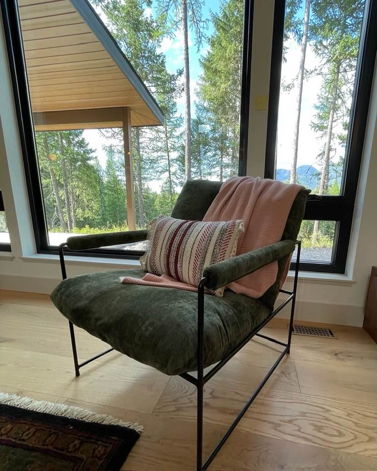 I found a really comfy accent chair for our primary bedroom at HomeGoods. It feels like a soft velvet and the green works with our color scheme. The black metal frame ties into the other black elements in our home including the windows and stone. In the picture below it is sitting in our living room.