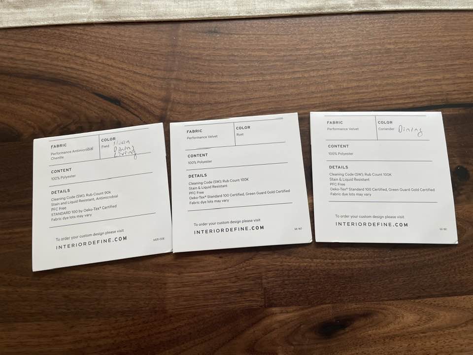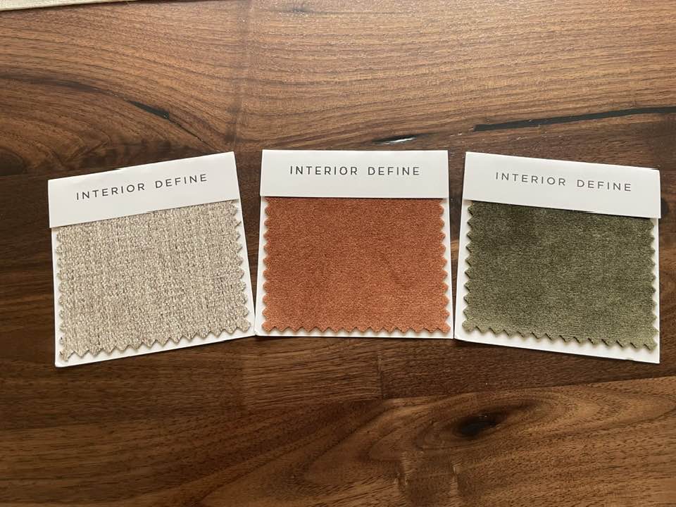 Our fabric and color selections – Chenille Field, Velvet Rust, and Velvet Coriander: