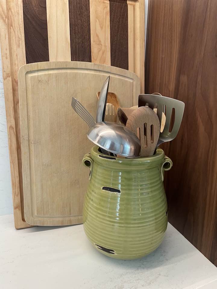 The pottery vase I found in another shop works great for our large kitchen utensils. I had a stainless steel one in the past, but this is so much prettier.