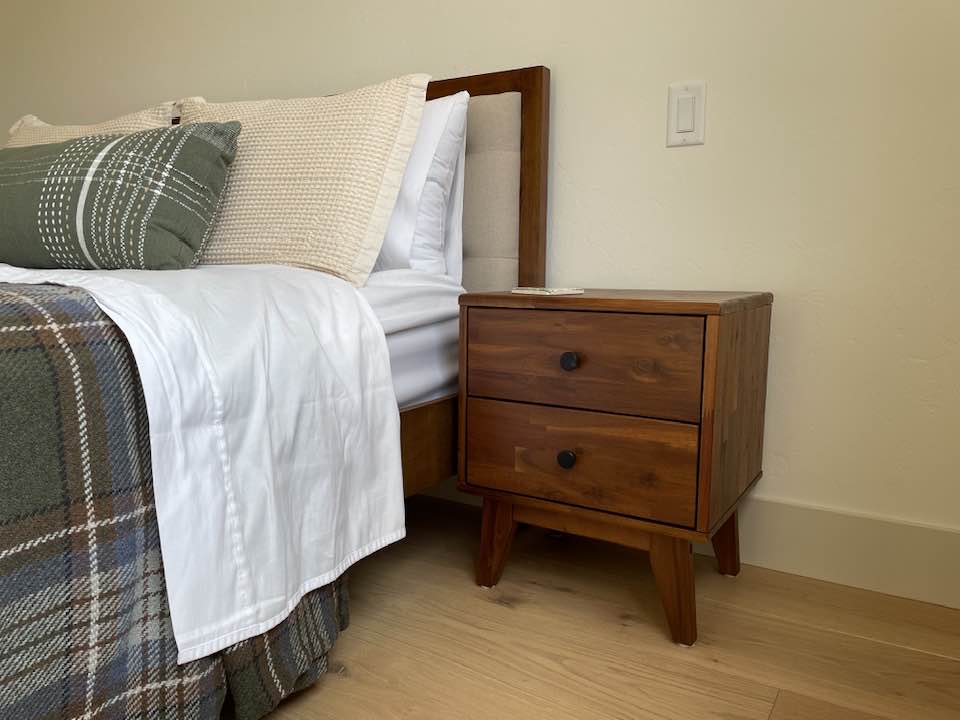 The Acacia Silvia Solid Wood Nightstand with 2 – drawers by George Oliver are made of hardwood and are sturdier. At $187 each, they are quite the bargain! Although they are a bit more expensive these would be my top pick of the two. In the picture below, you’ll see they are the right height for the bed in the meadow view guest room.