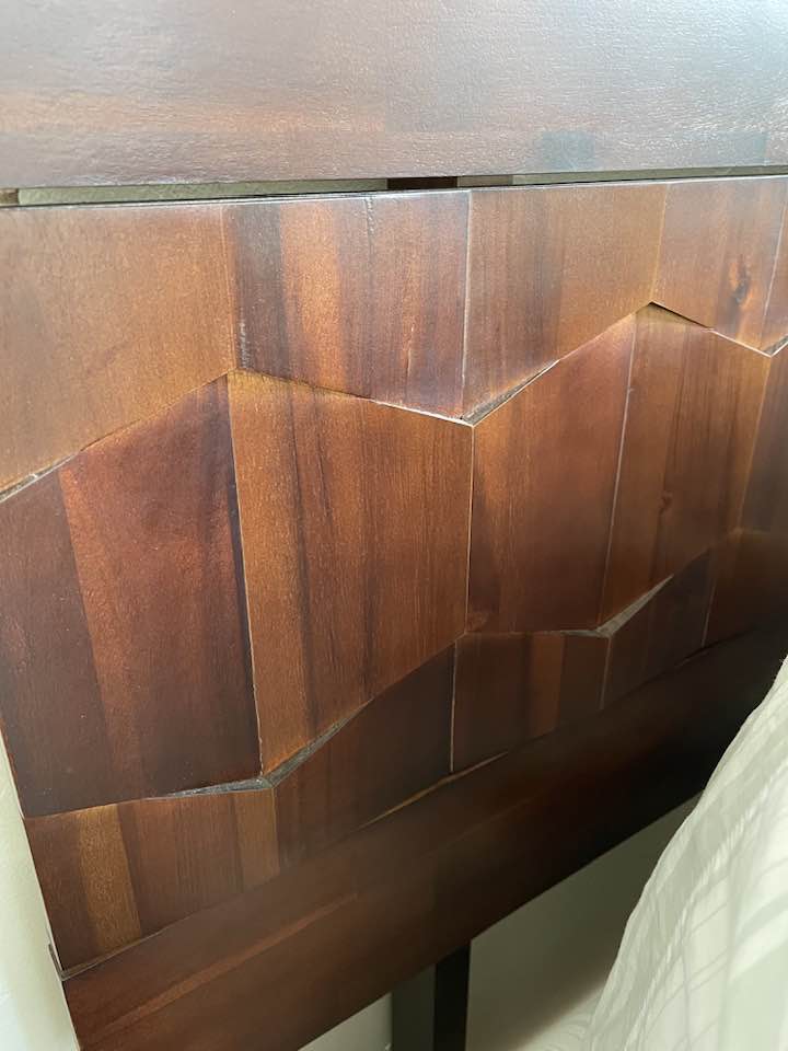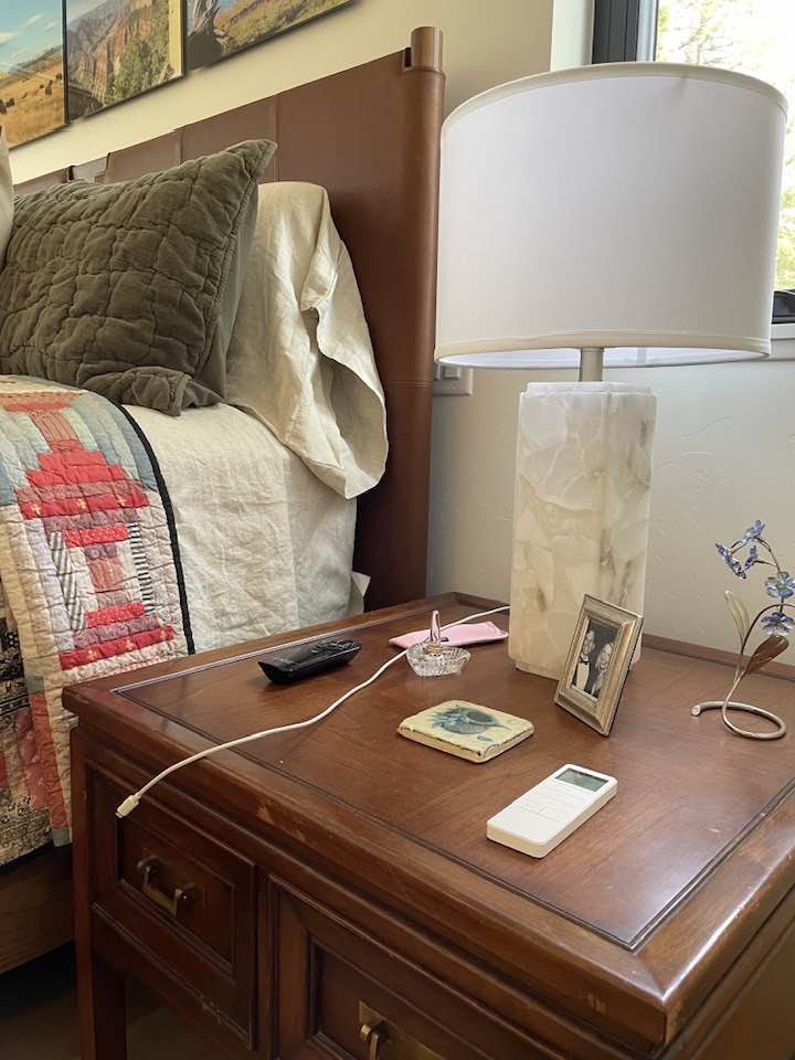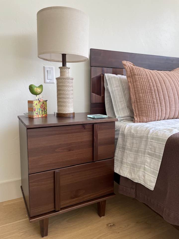 As you can tell in the pictures below, the vintage tables are too low for our new bed. Your nightstands should be within 1-2″ of the top of your mattress so you can comfortably reach anything on the table. If we can’t use these MCM tables somewhere else in the house, I’ll sell them via Facebook Marketplace.
